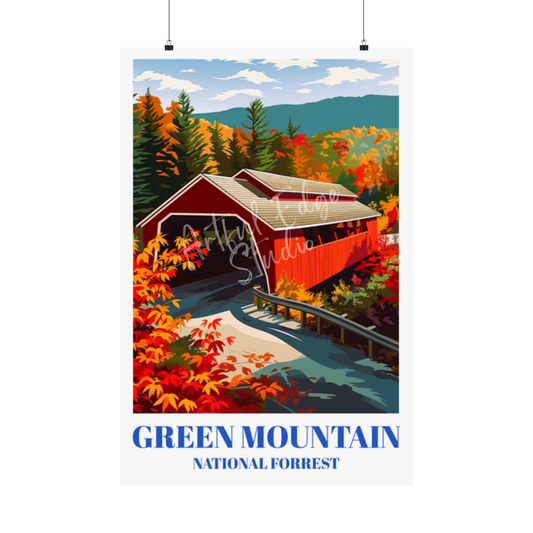 Green Mountain National Forest, Vermont Travel Poster, Red Covered Bridge