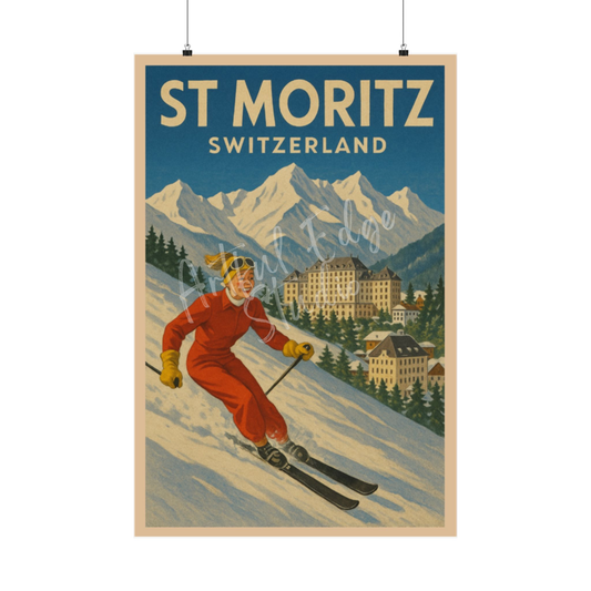 Vintage Style St. Moritz Switzerland Ski Travel Poster – Retro Winter Alpine Ski Resort Wall Art