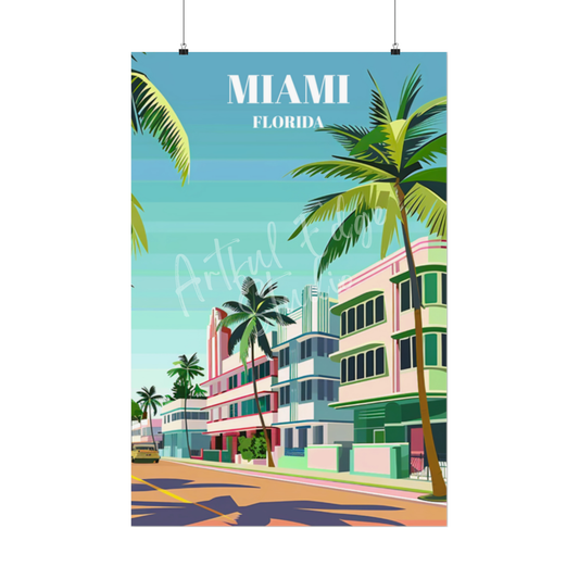 Vintage Miami, FL Art Deco Historic District Travel Poster, South Beach Views