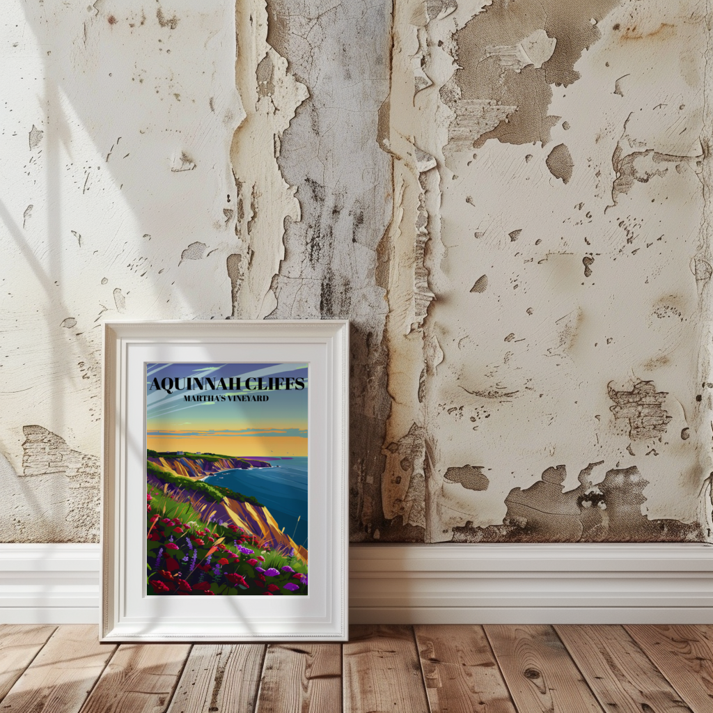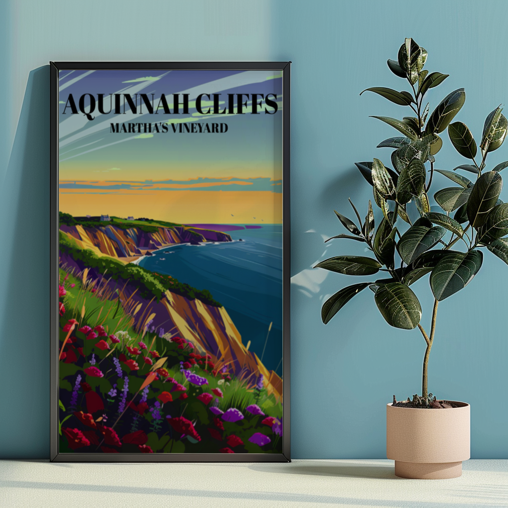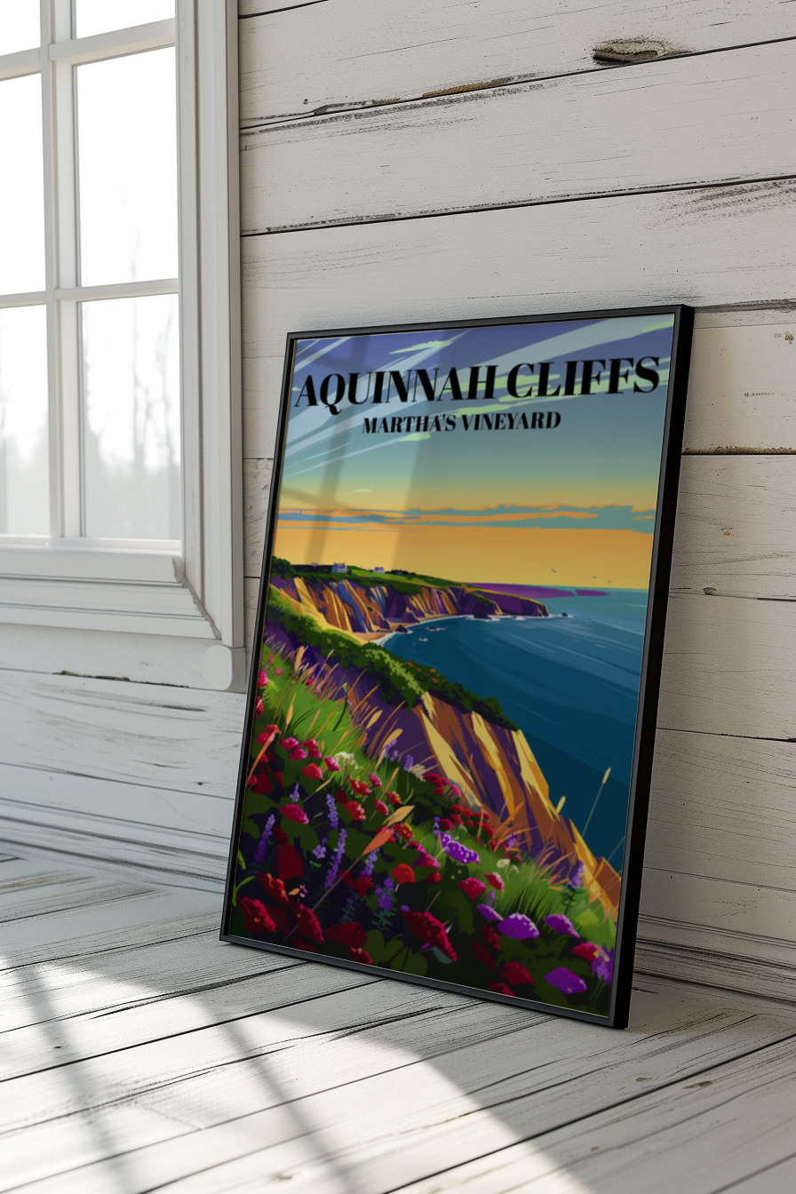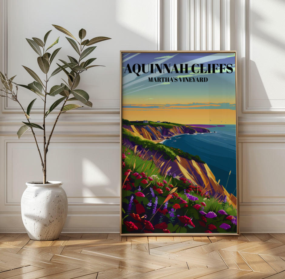 Immerse yourself in the breathtaking beauty of Martha's Vineyard with our Aquinnah Cliffs travel poster. Capturing the vivid hues of the iconic Gay Head Cliffs at sunset, this artwork brings the stunning coastal landscape of New England into your home. Transport yourself to the tranquil shores of Aquinnah as you gaze upon the rugged cliffs against the backdrop of the shimmering ocean. Perfect for beach lovers, nautical enthusiasts, and anyone who cherishes the natural wonders of the coastline. Whether you're a local longing for home or a traveler seeking mementos of your adventures, this poster is a must-have addition to your decor. Printed on high-quality paper, it makes a thoughtful gift for those who appreciate the timeless charm of Martha's Vineyard. Add a touch of coastal elegance to your space and let the beauty of Aquinnah Cliffs inspire your wanderlust.