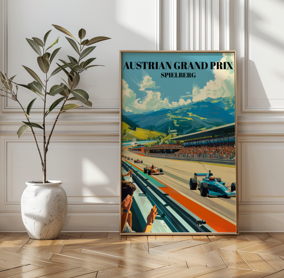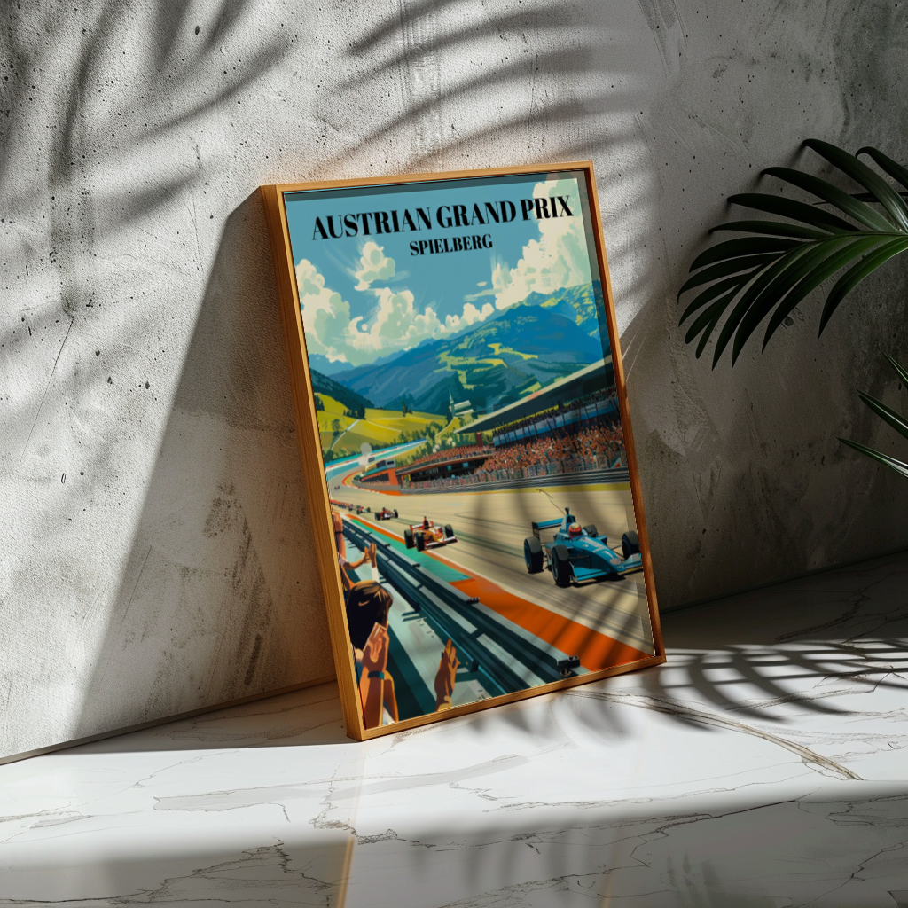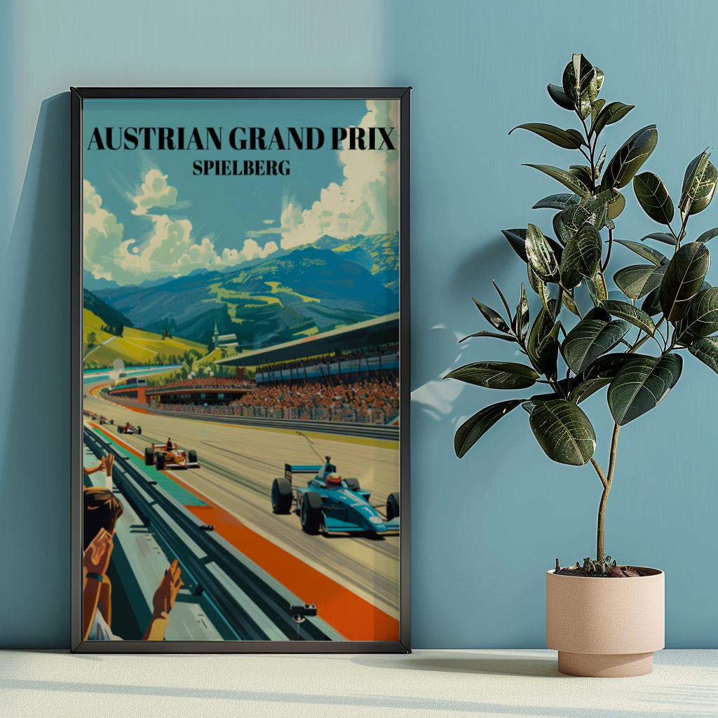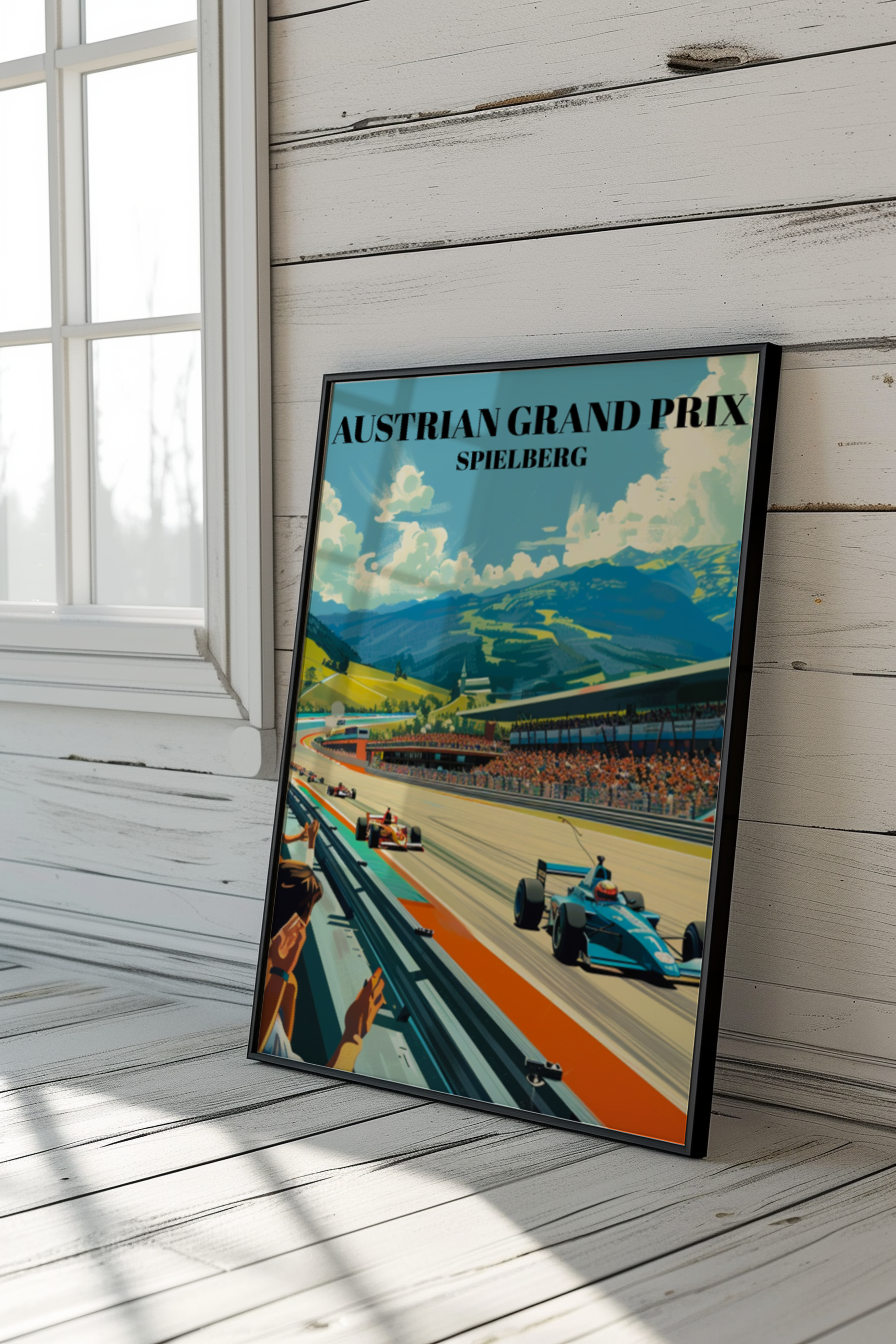 Celebrate the Austrian Grand Prix at Spielberg with this stunning travel poster! Featuring the iconic Red Bull Ring, this vibrant Formula 1 art print is perfect for any motorsport enthusiast. Detailed and eye-catching, it captures the excitement of the Spielberg circuit. Ideal as racing decor, this poster makes a unique gift for F1 fans and collectors. Add a touch of Austrian racing history to your home with this beautiful piece of wall art. Perfect for any Formula 1 memorabilia collection, this poster brings the thrill of the track to your space!