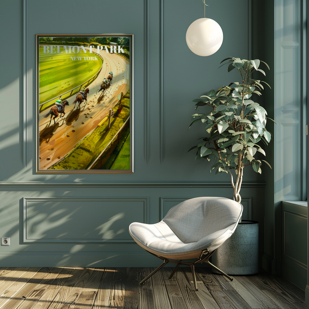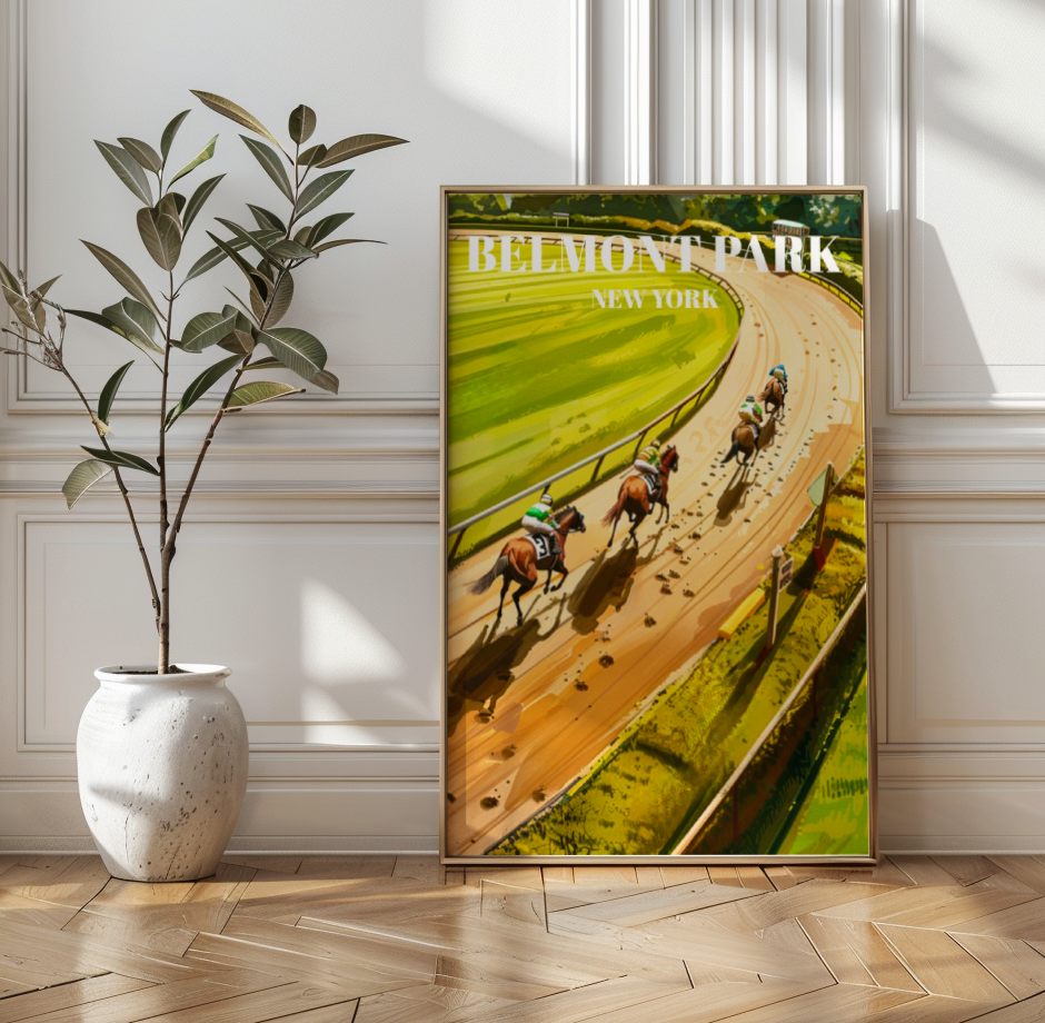 Discover the timeless charm of Belmont Park Racetrack with this vintage travel poster. Capturing the historic essence of New York's iconic horse racing venue, this art print celebrates the excitement of the Belmont Stakes and thoroughbred racing. Perfect for equestrian enthusiasts and fans of NYC sports venues, this classic racing memorabilia adds a touch of elegance to any space. Whether you're decorating your home, office, or a sports bar, this poster brings the thrill of Belmont Park to life. Ideal for collectors and those who appreciate historic New York landmarks.