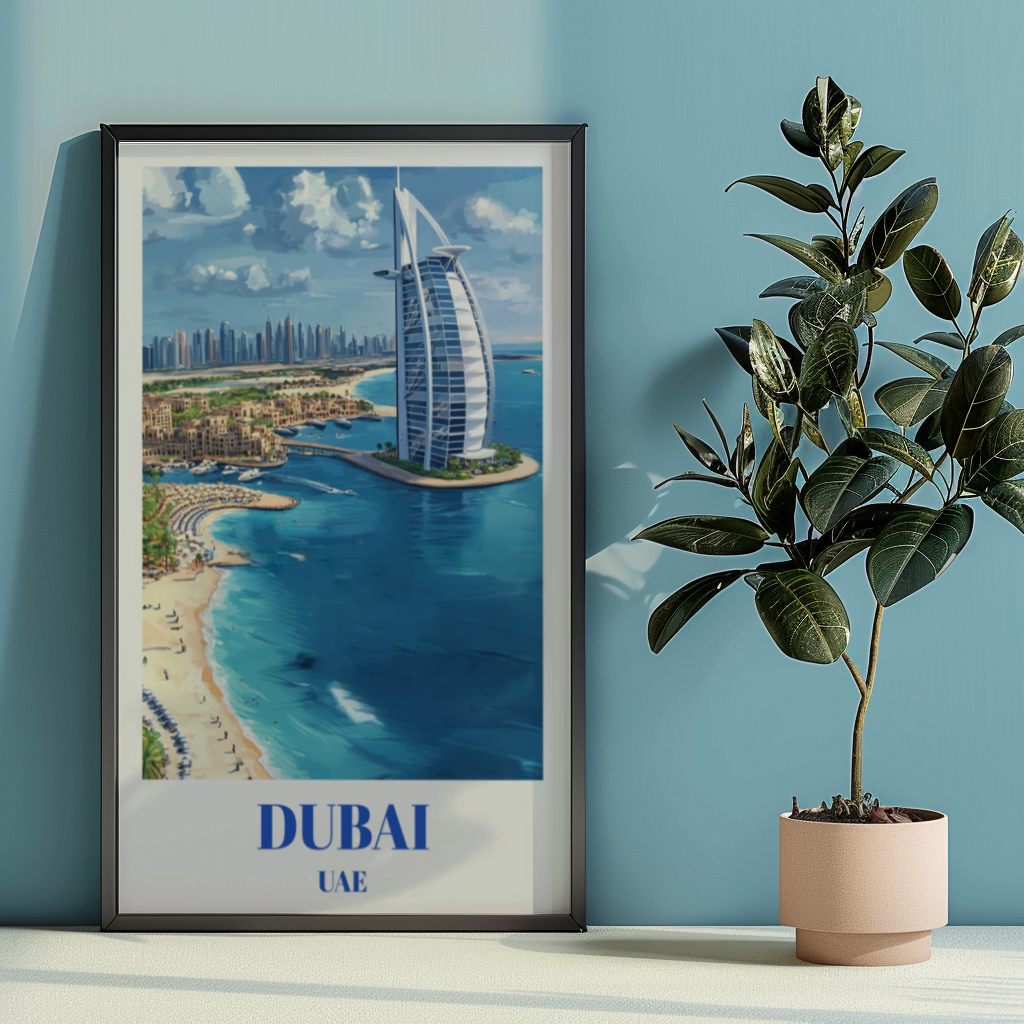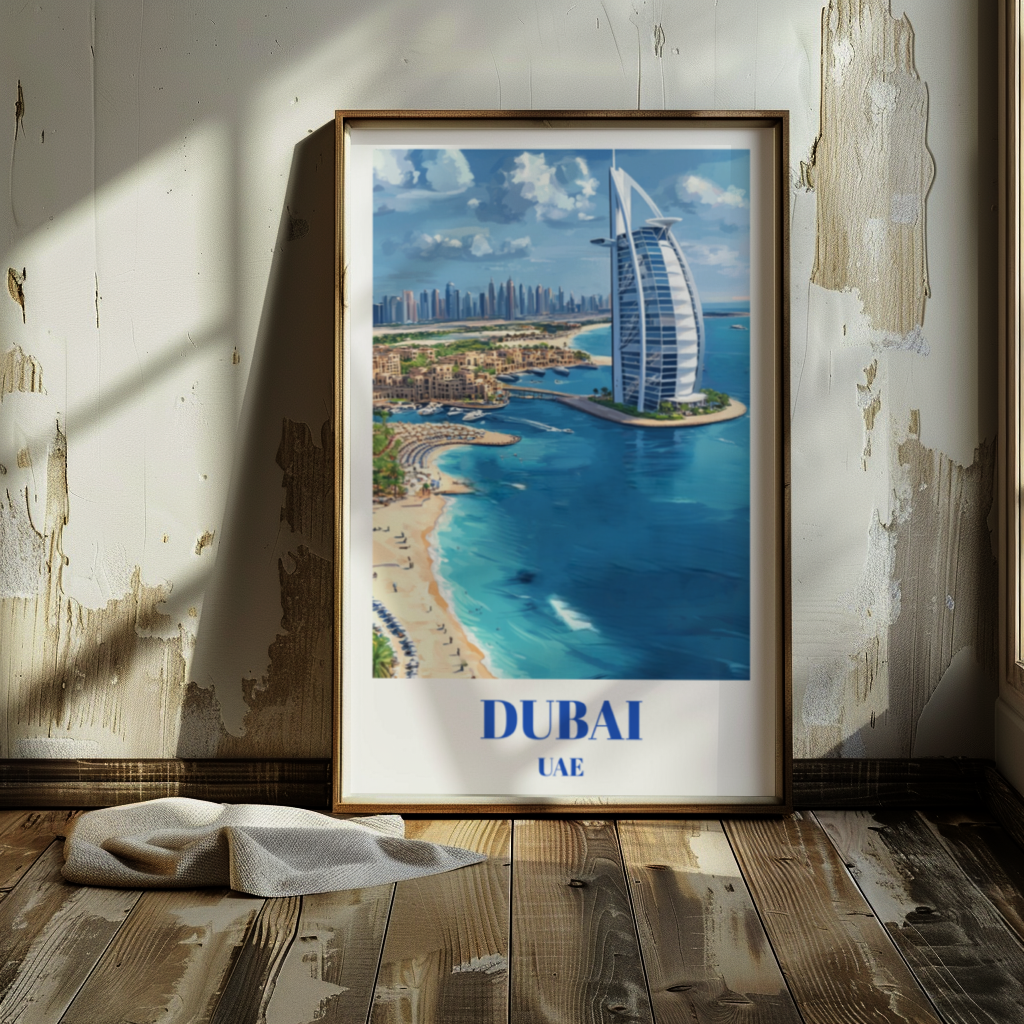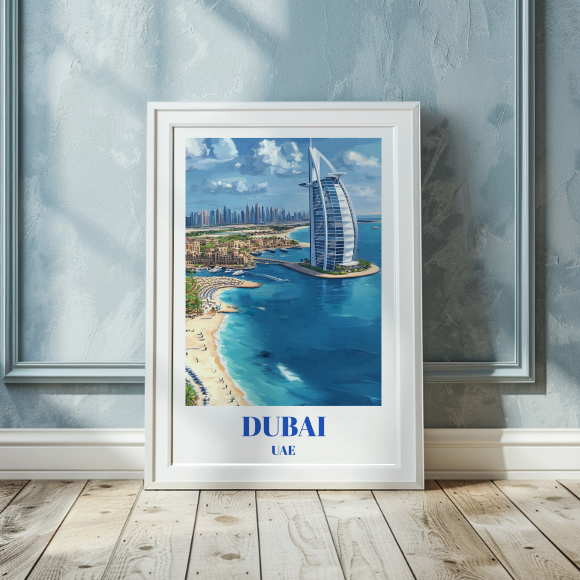 Bring the magic of Dubai to your walls with this stunning travel poster featuring the iconic Burj Khalifa, Palm Jumeirah, and the mesmerizing Arabian Desert. Perfect for fans of Middle Eastern art, this Dubai UAE cityscape adds a modern, elegant touch to any space. Ideal as a gift for travelers or to celebrate your favorite destination, this artwork captures the vibrant culture and skyline of Dubai. Great for home or office decor, it’s a must-have for anyone who loves the beauty of the UAE. Transform your walls with this timeless piece!