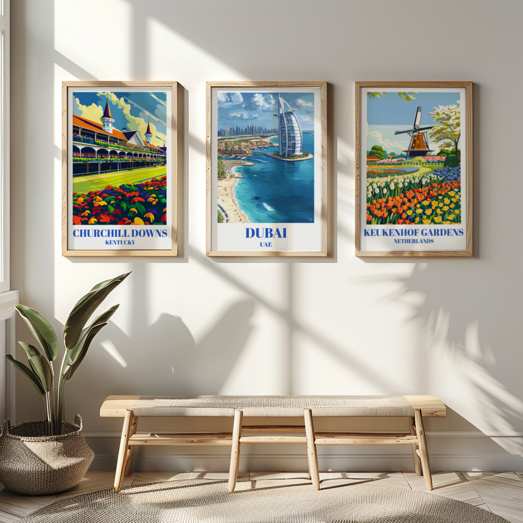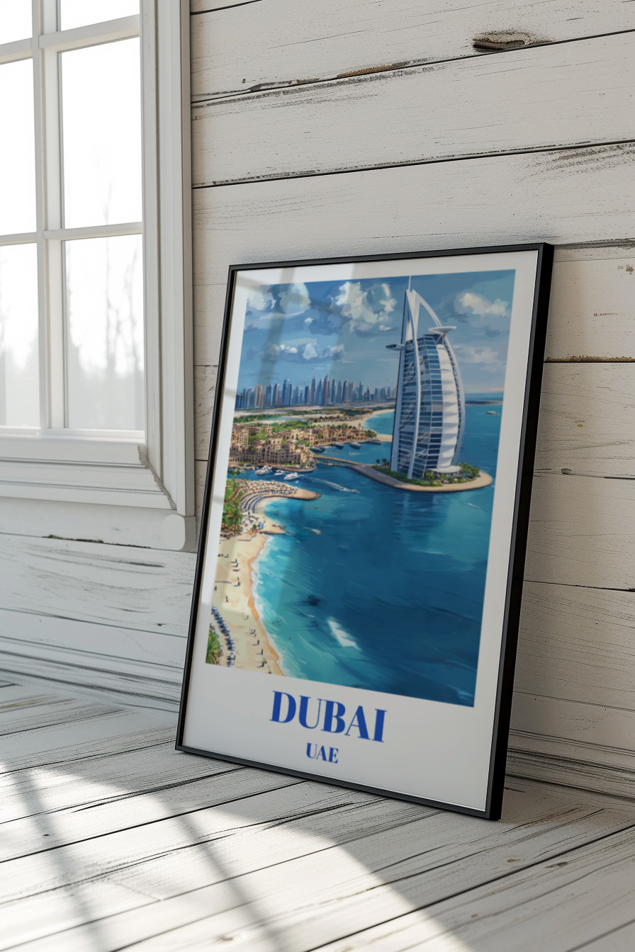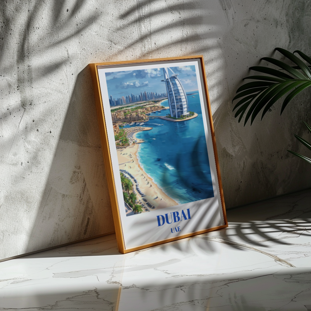 Bring the magic of Dubai to your walls with this stunning travel poster featuring the iconic Burj Khalifa, Palm Jumeirah, and the mesmerizing Arabian Desert. Perfect for fans of Middle Eastern art, this Dubai UAE cityscape adds a modern, elegant touch to any space. Ideal as a gift for travelers or to celebrate your favorite destination, this artwork captures the vibrant culture and skyline of Dubai. Great for home or office decor, it’s a must-have for anyone who loves the beauty of the UAE. Transform your walls with this timeless piece!