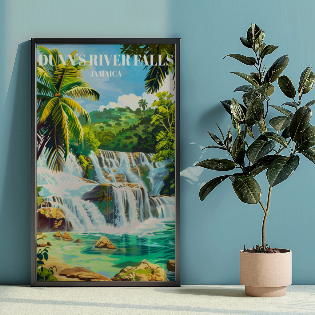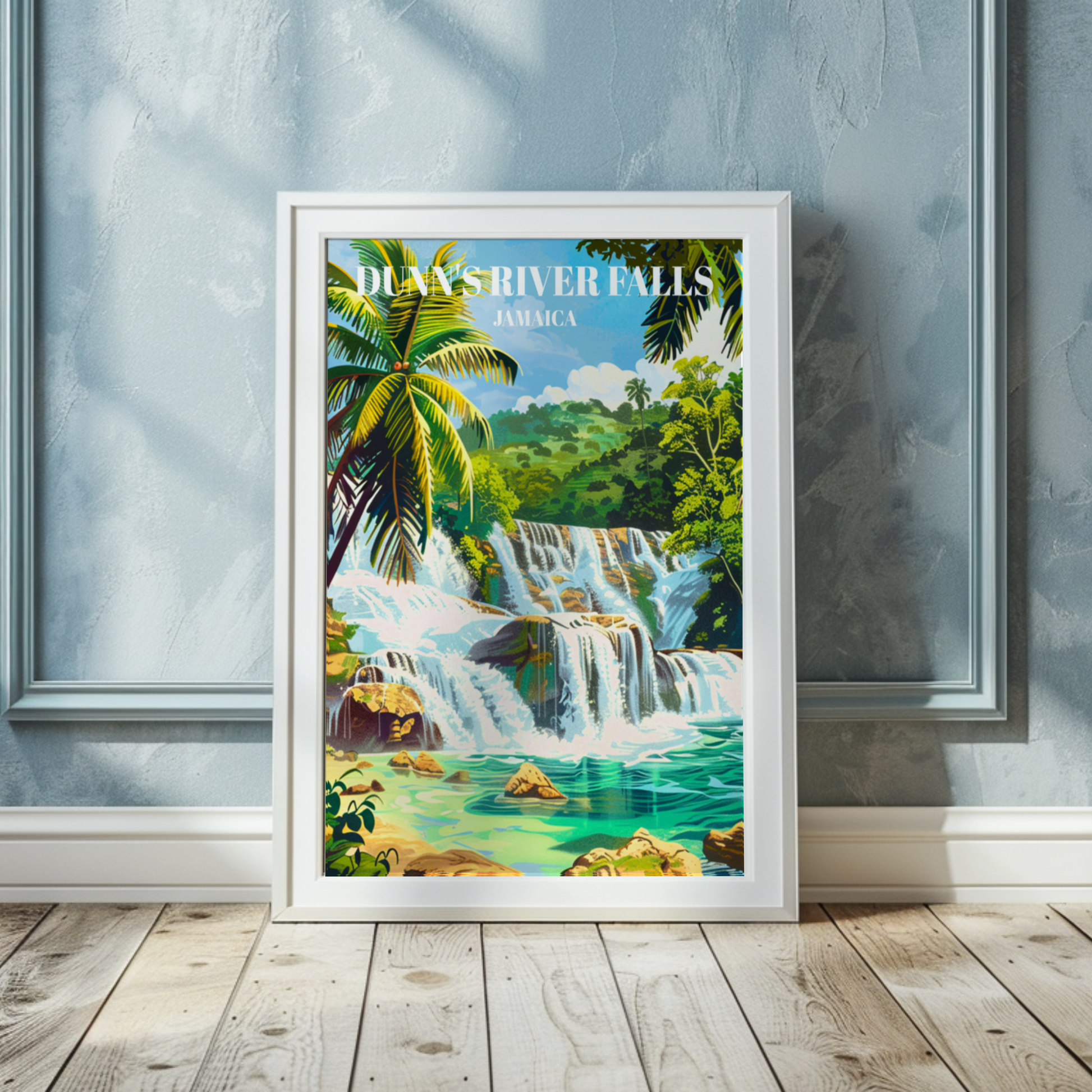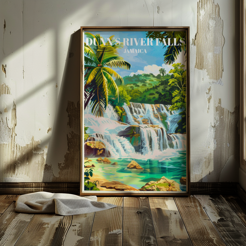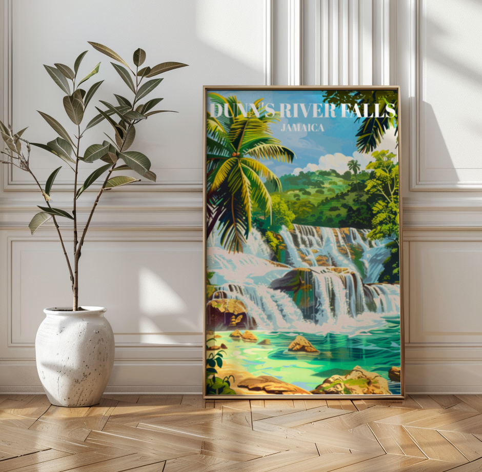 Immerse yourself in the natural beauty of Dunn's River Falls, Jamaica with this captivating travel poster. Featuring the iconic cascading waterfalls nestled in lush greenery, this artwork brings the spirit of adventure and tropical allure into your home. Transport yourself to the vibrant landscapes of Ocho Rios with every glance, as the vivid colors and dynamic composition evoke memories of Caribbean vacations. Whether you're a nature enthusiast, a lover of travel, or simply seeking a stunning statement piece for your decor, this Dunn's River Falls poster is sure to delight. Perfect for adding a touch of island charm to any space, it's also a unique gift for fellow adventurers and Jamaica enthusiasts. Choose between framed or unframed options to suit your style and bring the essence of Jamaican paradise into your living space today!