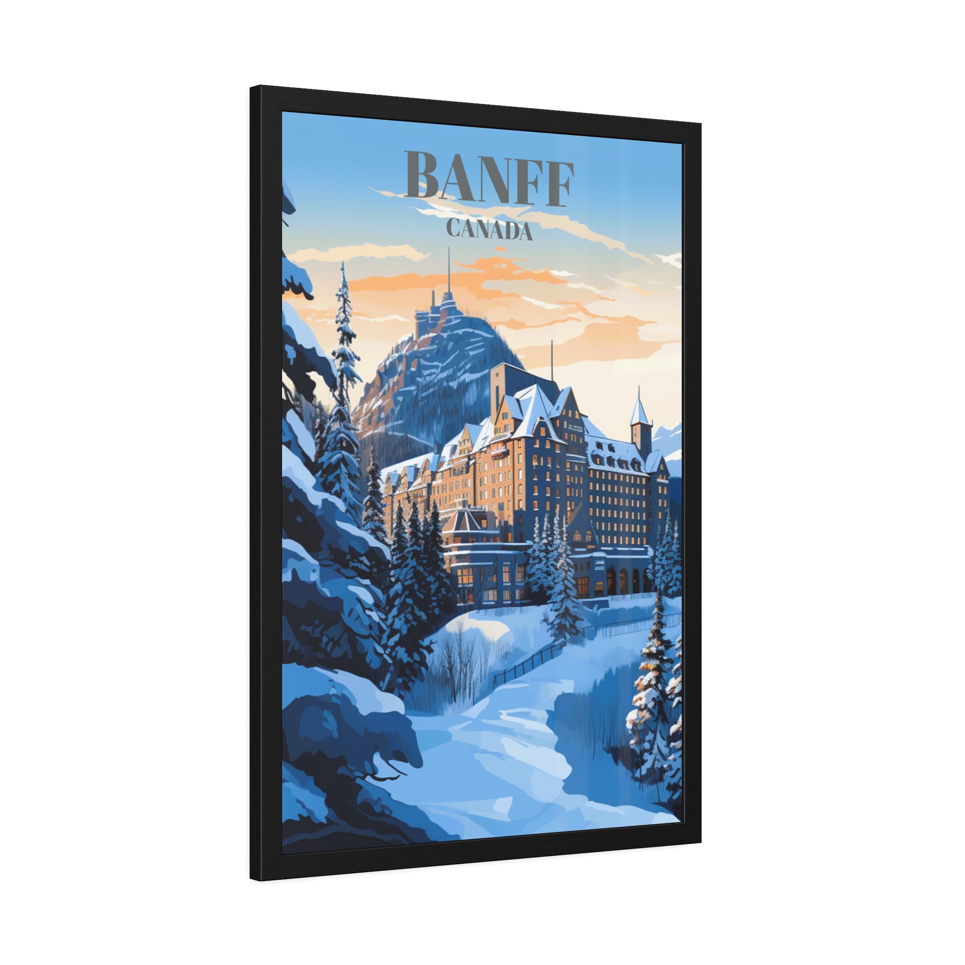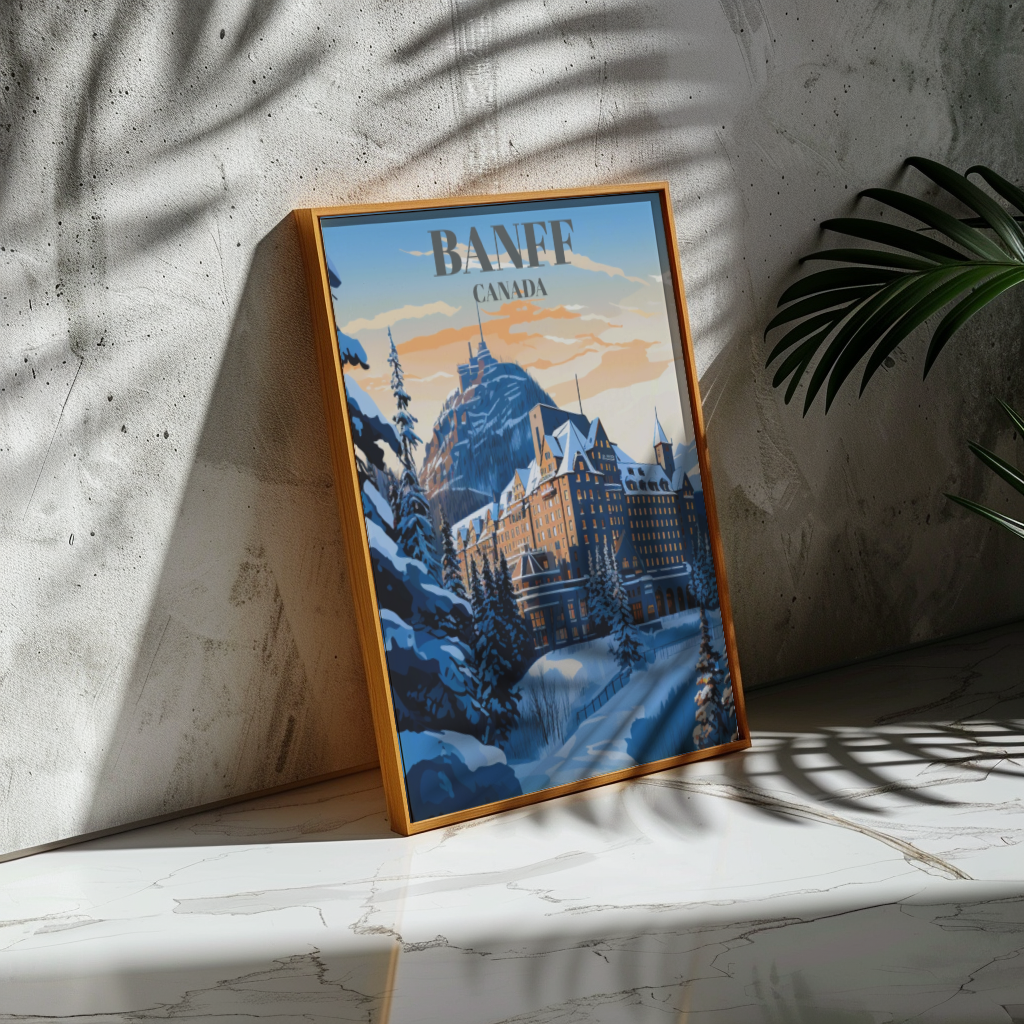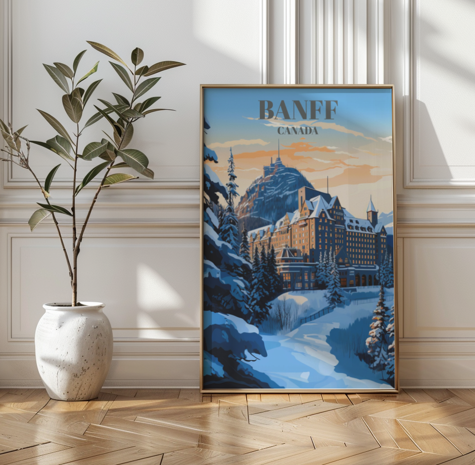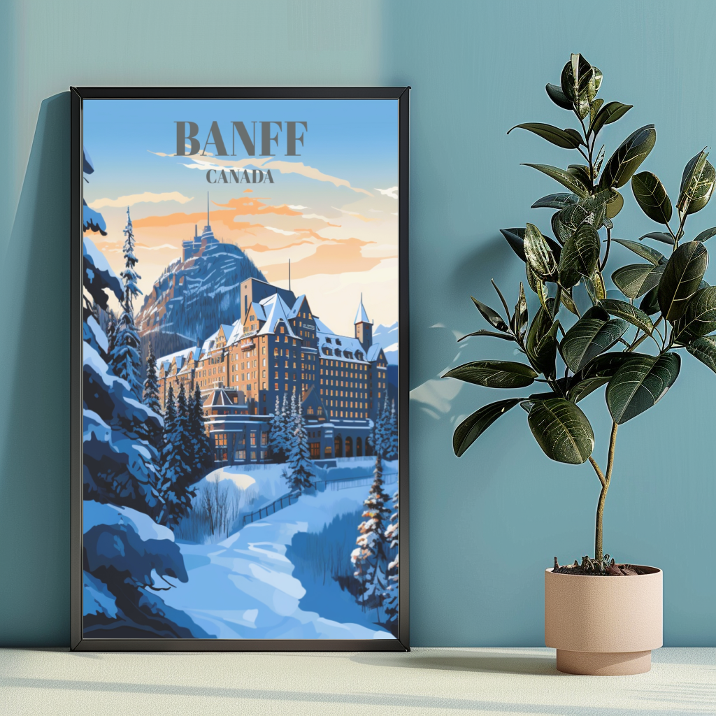 Experience opulence at its finest with our Fairmont Banff Springs Hotel travel poster, capturing the essence of luxury nestled in the heart of Banff, Canada. This exquisite wall art showcases the iconic hotel against the backdrop of the stunning Canadian Rockies. Whether framed or unframed, this poster is a visual masterpiece, offering a glimpse into the grandeur of Banff National Park's scenic landscapes.