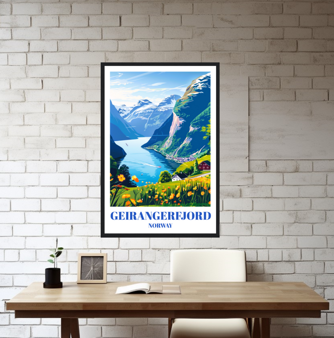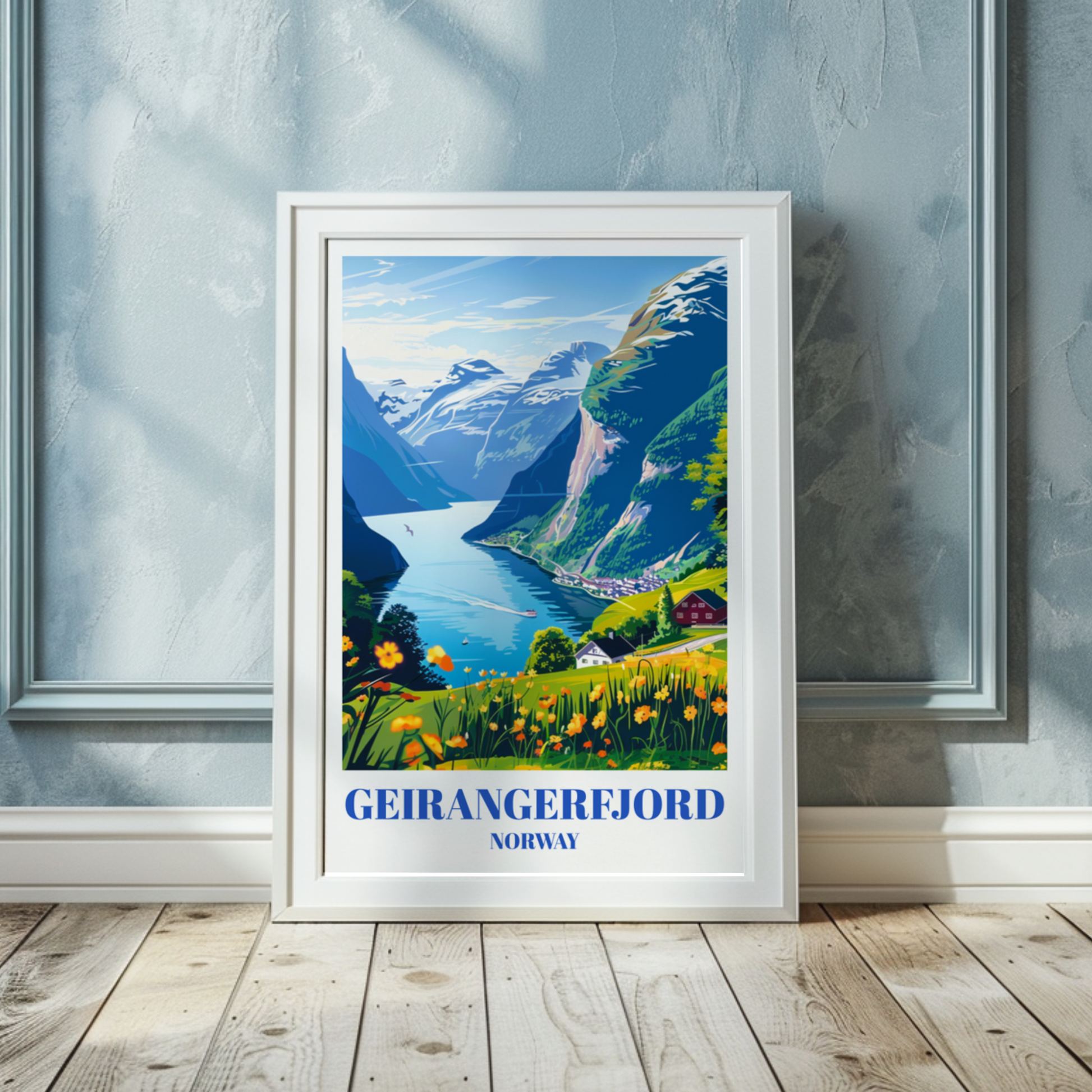 Transport yourself to the stunning beauty of Geirangerfjord, Norway with this captivating travel poster. Featuring the UNESCO World Heritage Site's majestic mountains, cascading waterfalls, and serene waters, this poster is a visual feast for nature lovers and travel enthusiasts alike. Adorn your walls with the breathtaking Scandinavian landscape captured in vivid detail, perfect for adding a touch of Nordic charm to any space. Whether you're a fan of mountain photography, Nordic decor, or simply seeking a unique travel souvenir, this poster is sure to impress. Bring home the essence of Geirangerfjord and indulge in the tranquility of Norwegian fjord scenery every day. Ideal for Scandinavian-themed homes, offices, or as a thoughtful gift for fellow adventurers and wanderers. Dive into the beauty of Norway's natural wonders and let this poster inspire your next journey into the heart of Scandinavia.