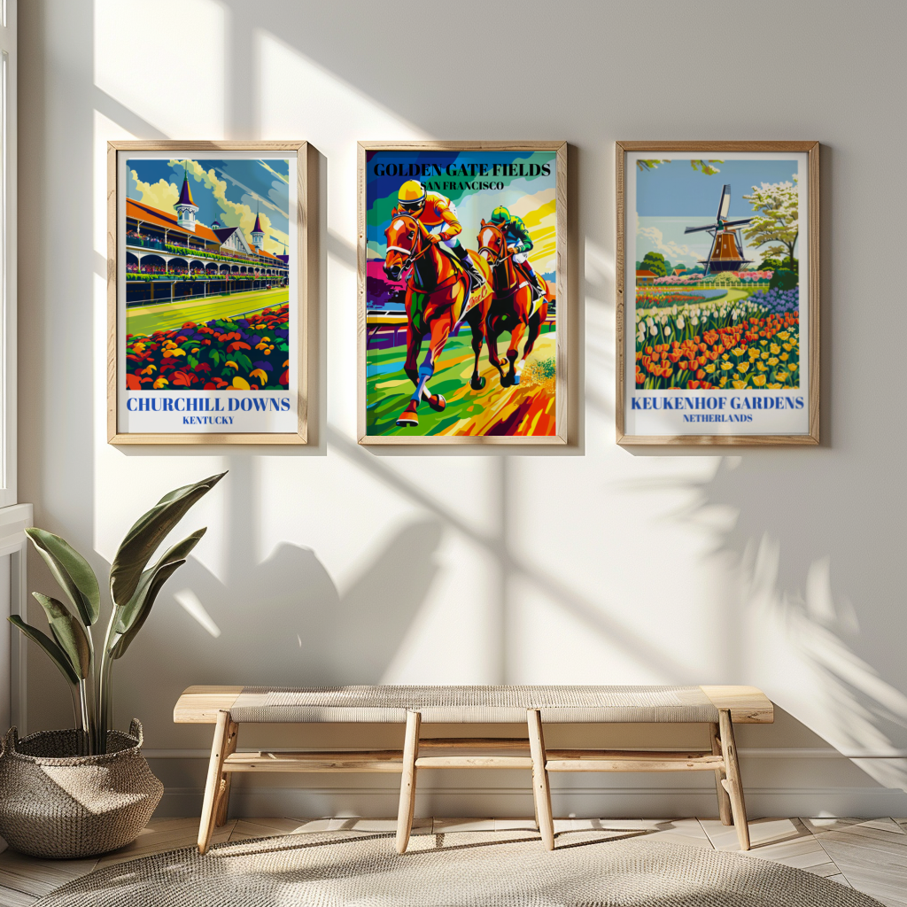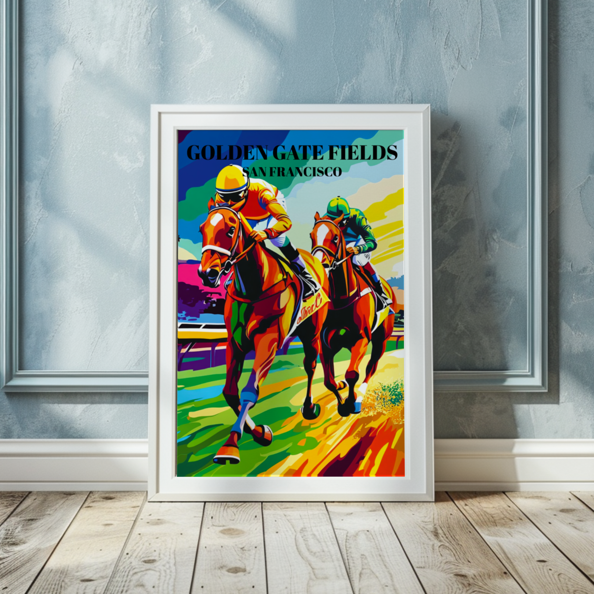 Celebrate the excitement of horse racing with this Golden Gate Fields travel poster! Featuring San Francisco's iconic race track in a vintage-style design, this print is perfect for fans of equestrian sports, Bay Area landmarks, and California travel art. Ideal as wall decor for your home, office, or game room, this artwork captures the charm of San Francisco and the elegance of Golden Gate Fields. Whether you're a racing enthusiast or love unique California art, this piece makes a perfect addition to your collection or a thoughtful gift!