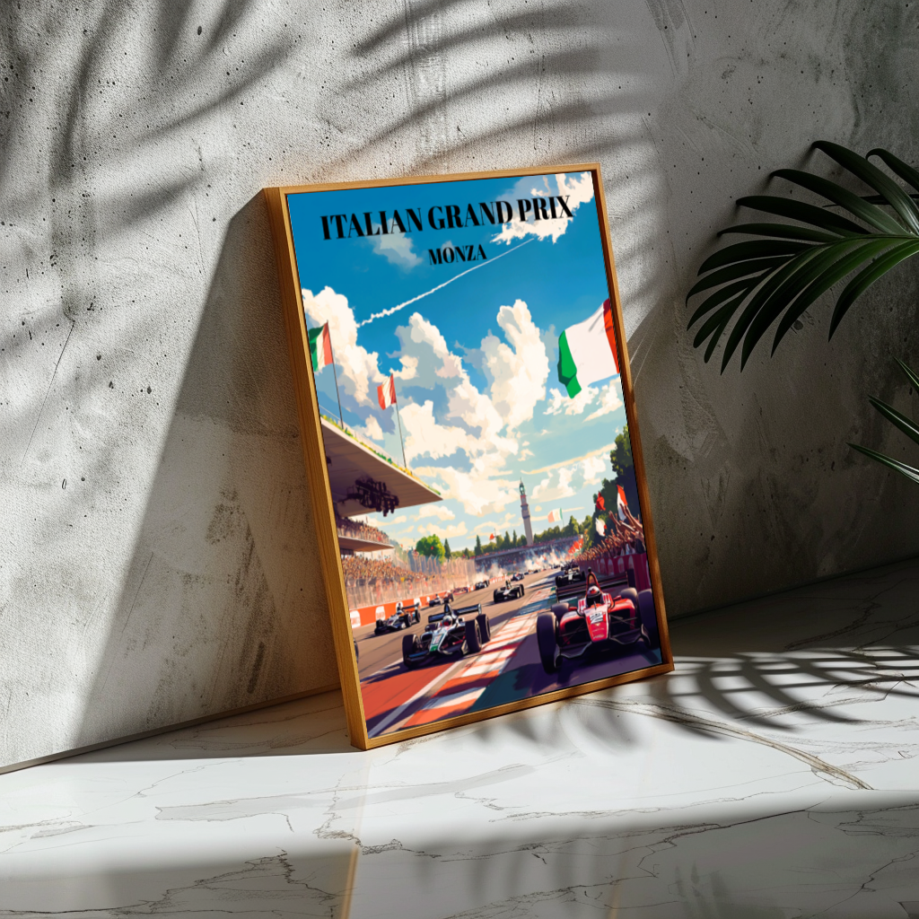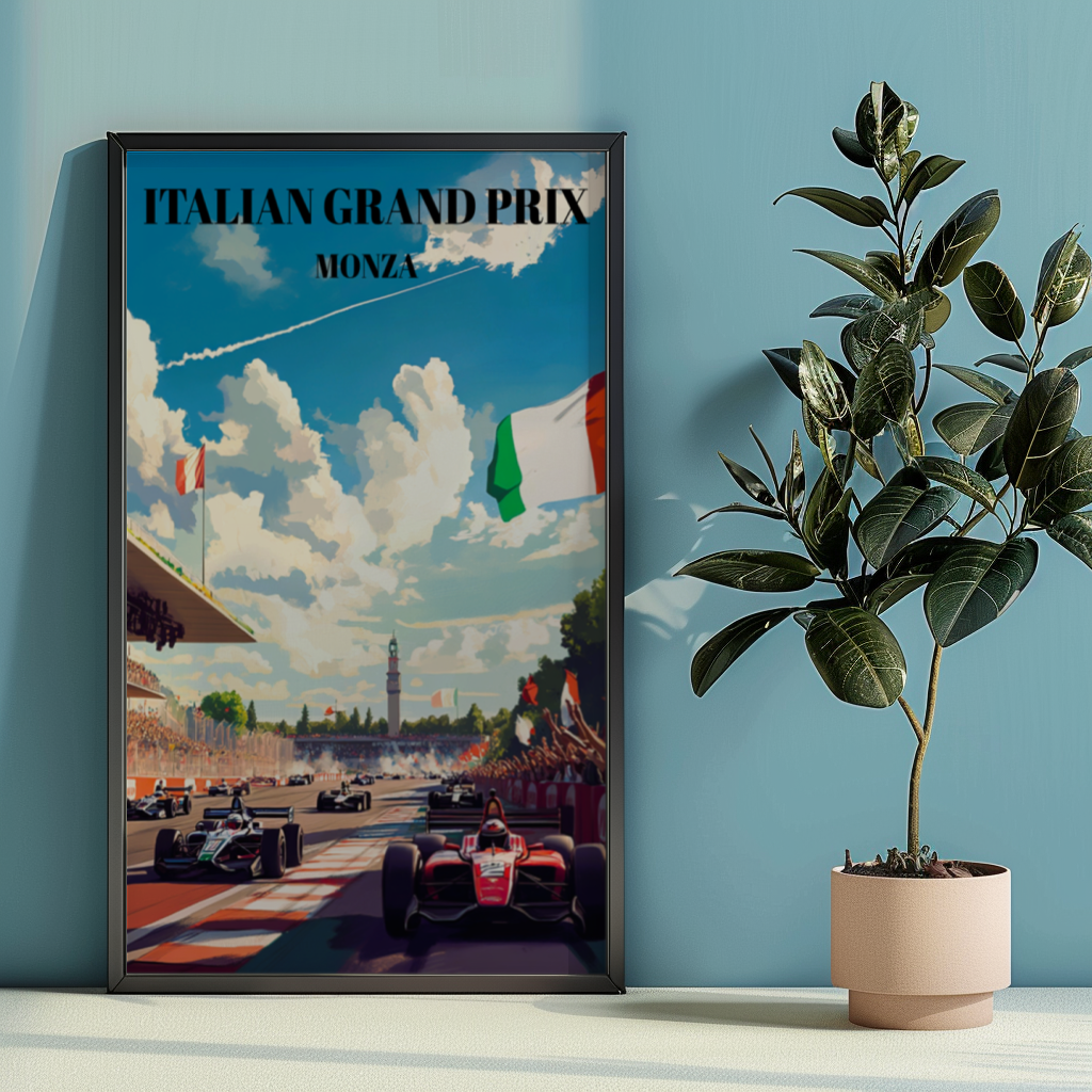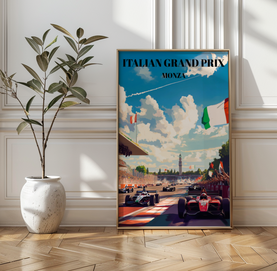 Celebrate the legendary Italian Grand Prix with this stunning Monza travel poster! Featuring the iconic Monza Circuit, this Formula 1 art print is perfect for motorsport fans and F1 enthusiasts. With its vintage design, it adds a classic racing vibe to any space—whether it's your living room, office, or man cave. This unique Monza track poster makes an ideal gift for lovers of Formula One and Italian racing history. Printed on high-quality paper, it’s a must-have addition to any F1 fan's collection.