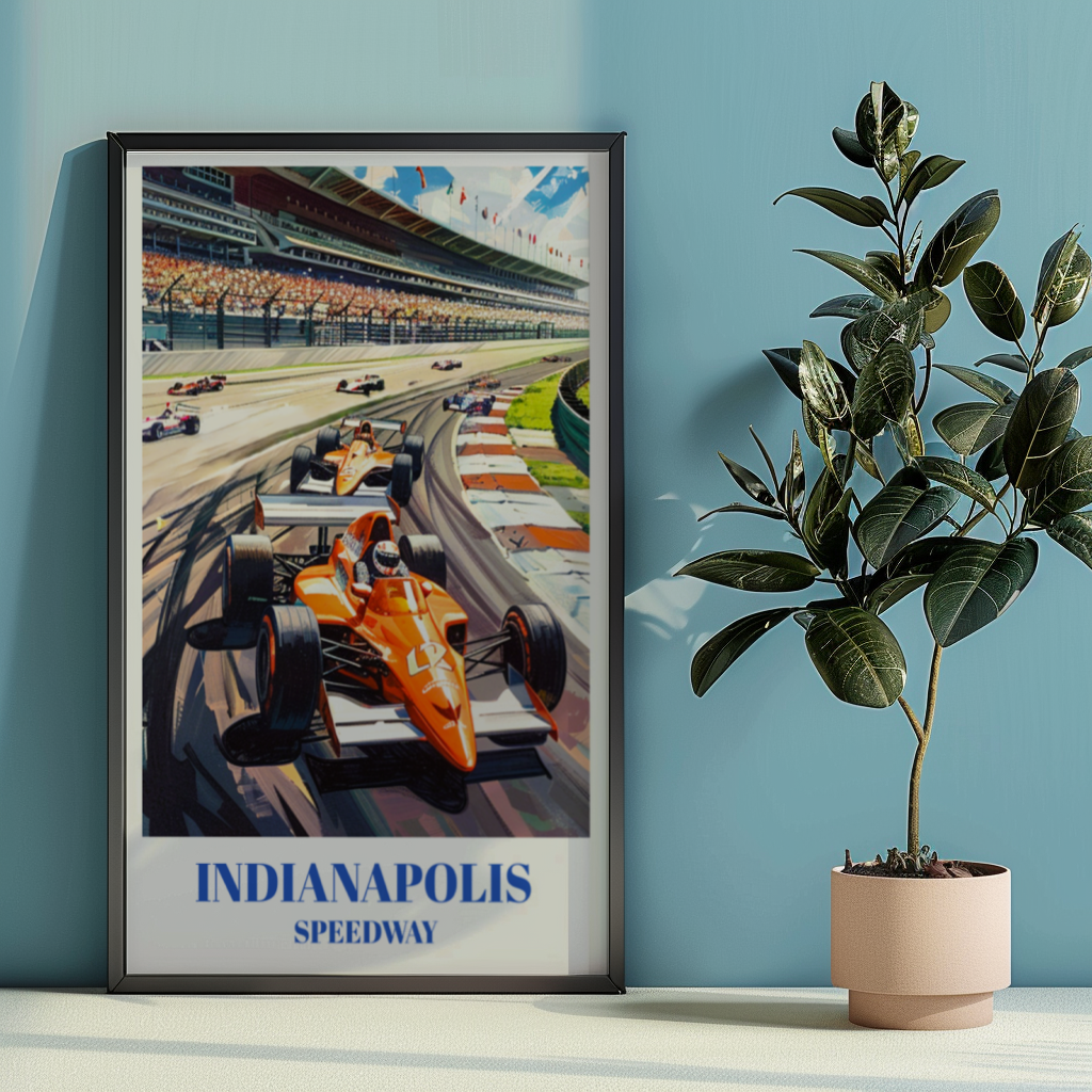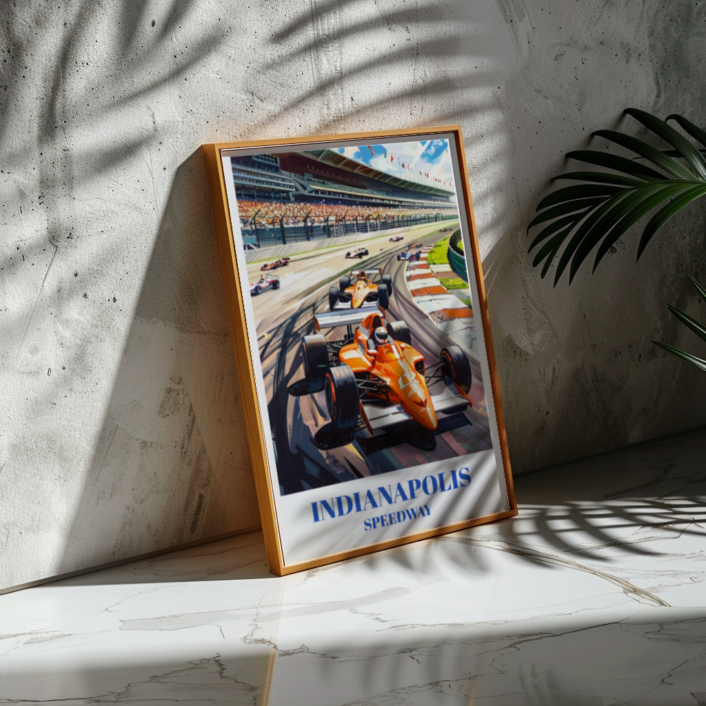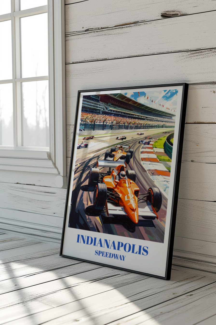 Celebrate the thrill of the Indianapolis 500 with this stunning travel poster of the iconic Indianapolis Motor Speedway. Perfect for race fans and car enthusiasts, this vintage-inspired wall art captures the excitement of the Indy 500. Featuring detailed illustrations of the historic racetrack, this poster is a must-have racing memorabilia. Ideal for home decor or as a unique gift, this classic motorsports decor piece brings the spirit of auto racing into any space. Enhance your collection with this beautiful and timeless race car artwork.