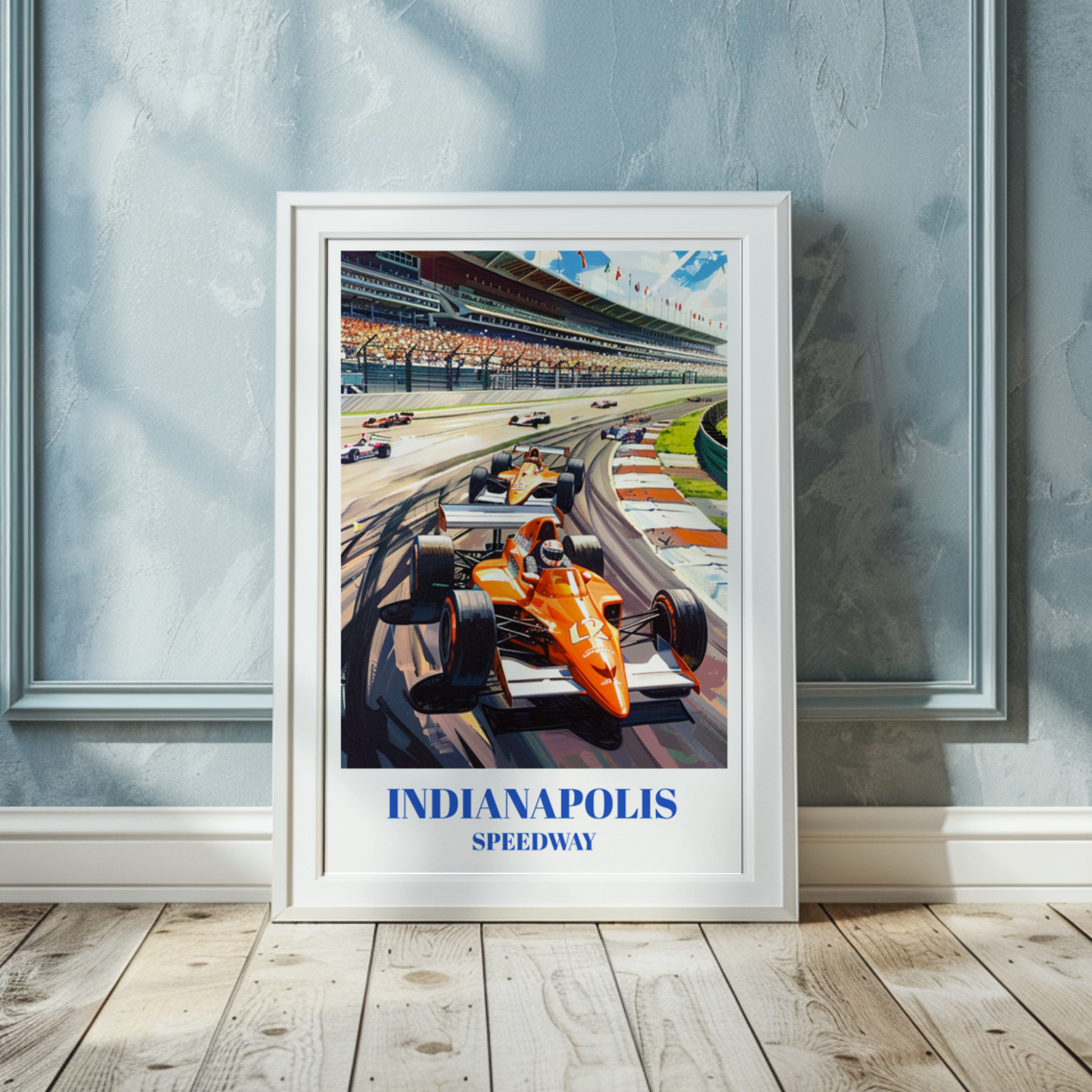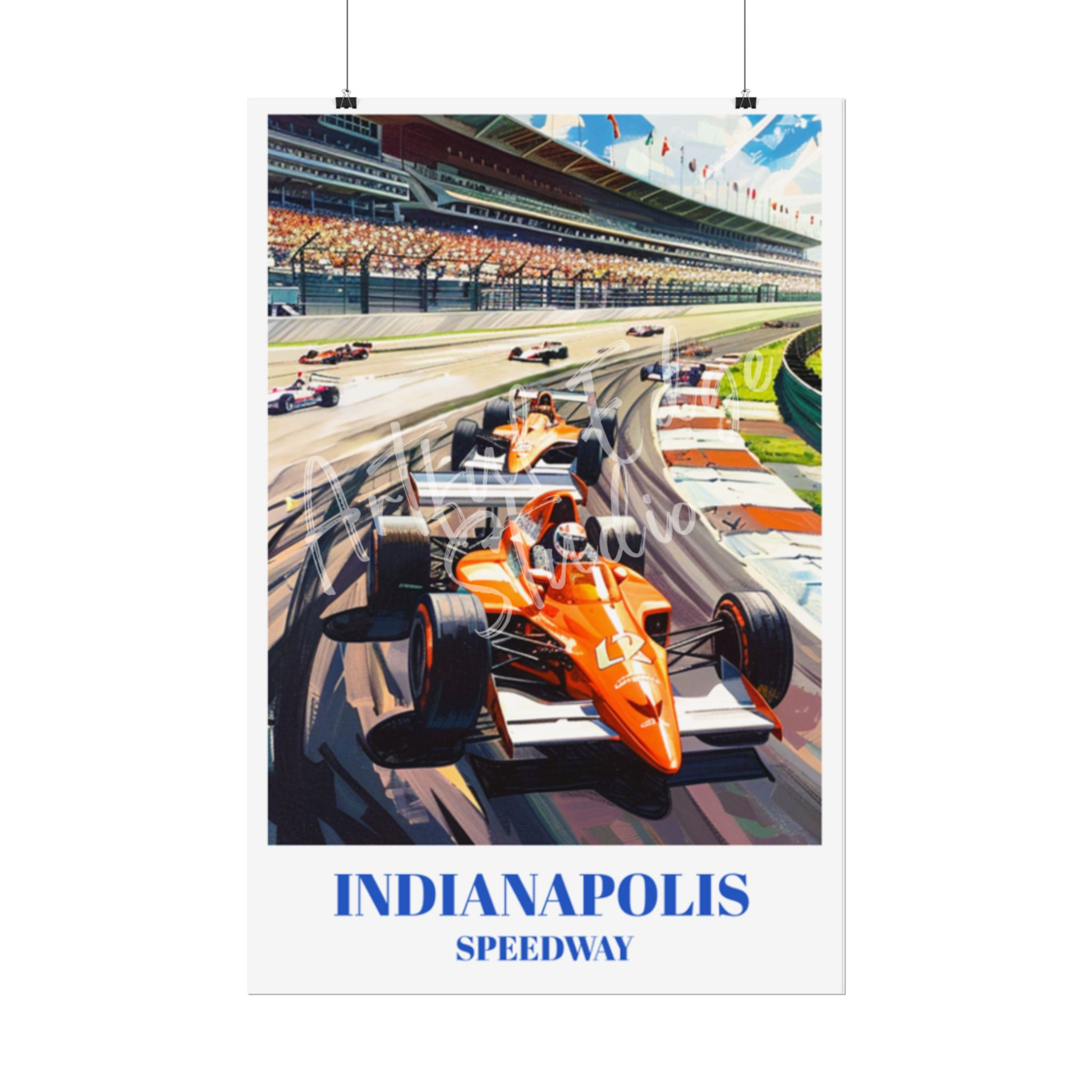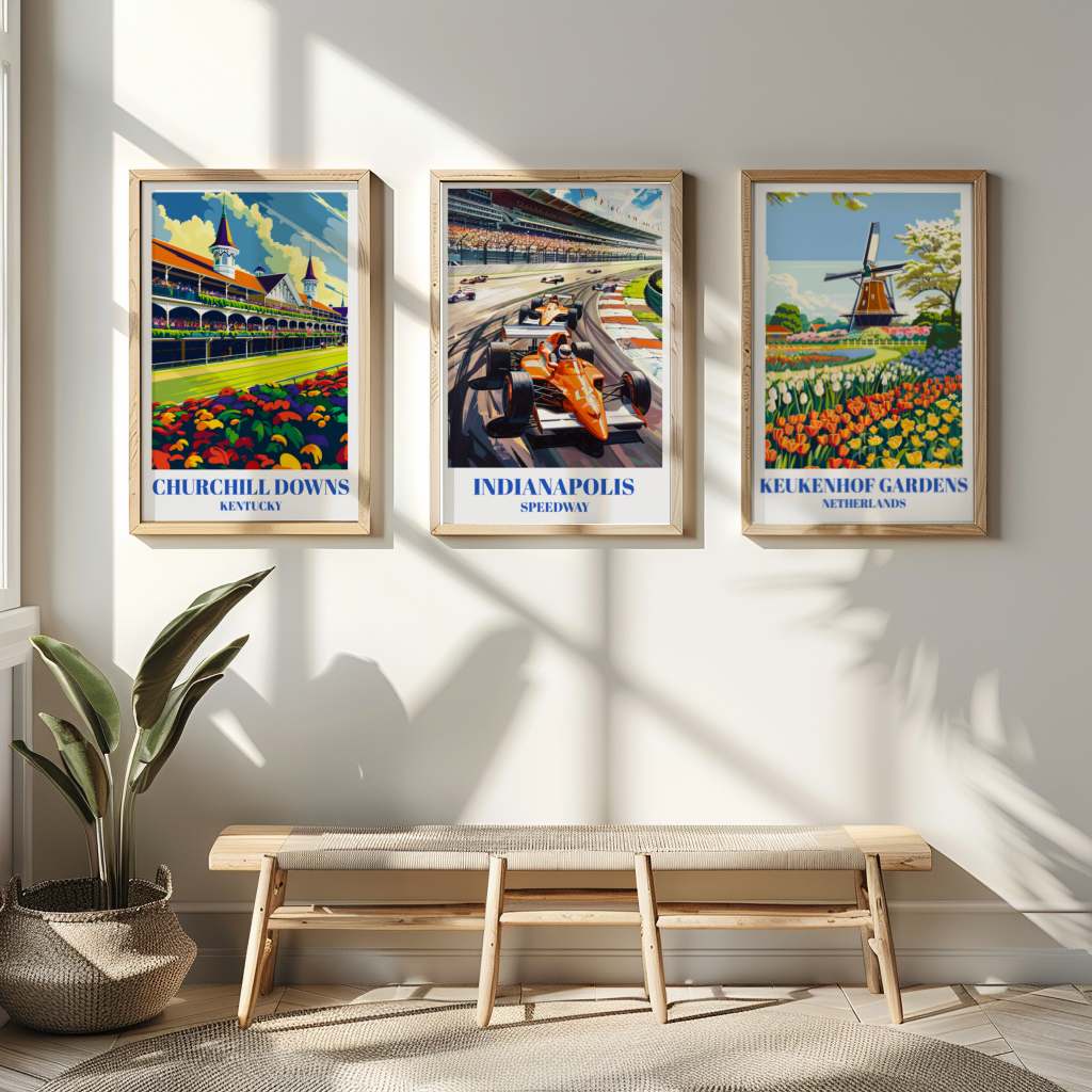 Celebrate the thrill of the Indianapolis 500 with this stunning travel poster of the iconic Indianapolis Motor Speedway. Perfect for race fans and car enthusiasts, this vintage-inspired wall art captures the excitement of the Indy 500. Featuring detailed illustrations of the historic racetrack, this poster is a must-have racing memorabilia. Ideal for home decor or as a unique gift, this classic motorsports decor piece brings the spirit of auto racing into any space. Enhance your collection with this beautiful and timeless race car artwork.
