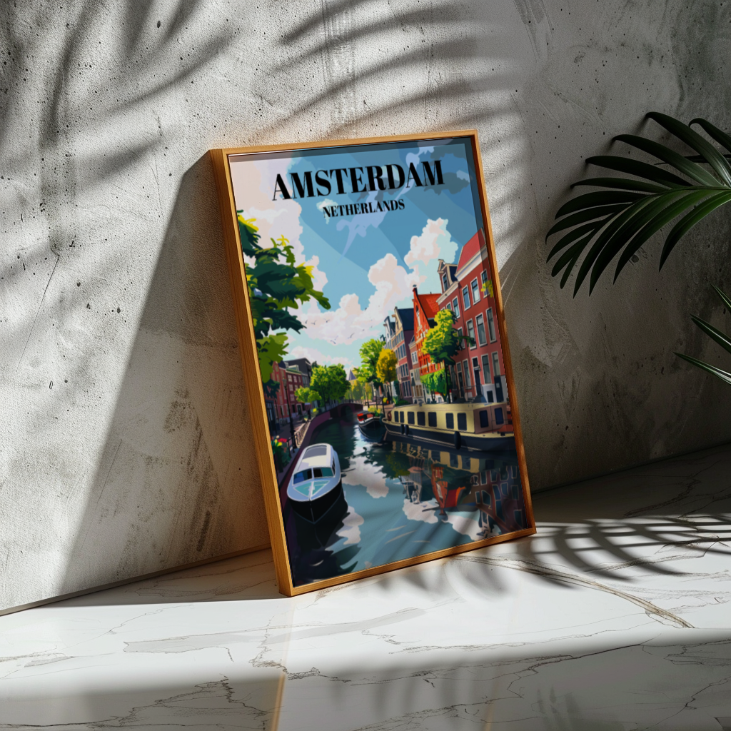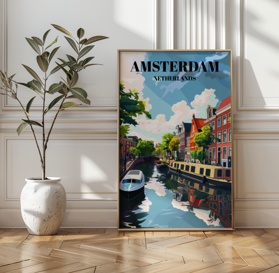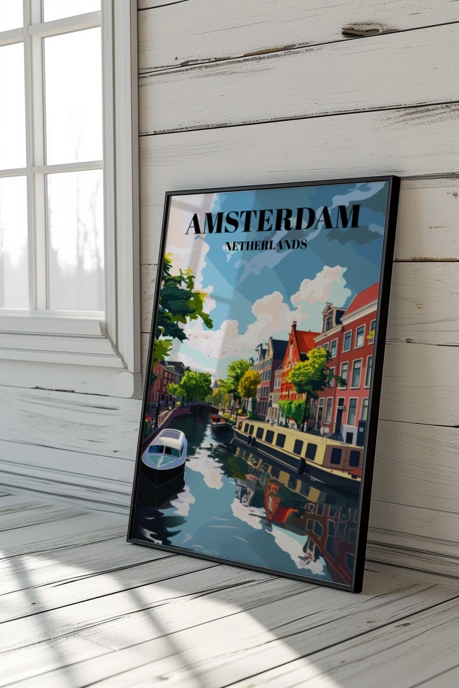 Immerse yourself in the timeless charm of Amsterdam's canals and the quaint streets of Jordaan with this captivating travel poster. Featuring the iconic Dutch cityscape, this print beautifully captures the essence of Amsterdam's picturesque canal scene. Whether you're a lover of European cityscapes, Dutch architecture, or simply seeking unique wall art, this poster is sure to delight. Add a touch of Holland to your home decor or gift it as a cherished souvenir of your travels.