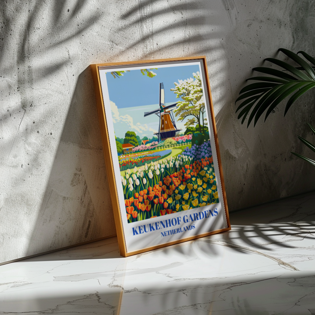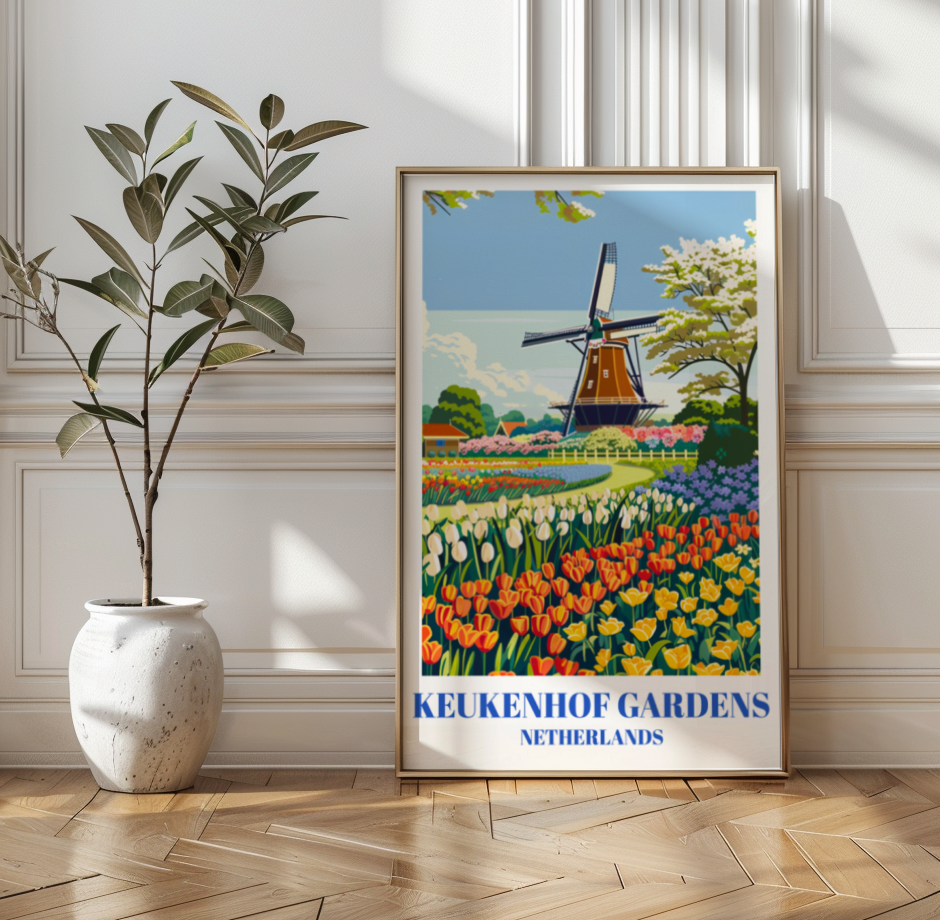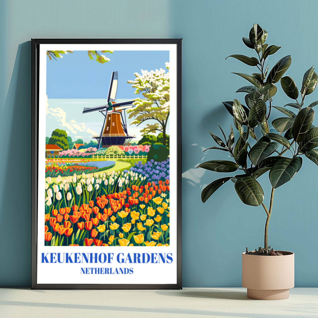 Immerse yourself in the vibrant beauty of Keukenhof Gardens, located in the picturesque Netherlands. This stunning travel poster captures the essence of Dutch tulip fields in full bloom, showcasing the vibrant colors and breathtaking landscapes that define this iconic destination. Hang this floral art print in your home or office to add a touch of Holland's natural splendor to your decor. Whether you're a nature enthusiast, a travel lover, or simply appreciate the beauty of botanical gardens, this print is sure to delight. Perfect as a souvenir or gift for anyone who cherishes the beauty of springtime and the allure of Dutch landscapes.