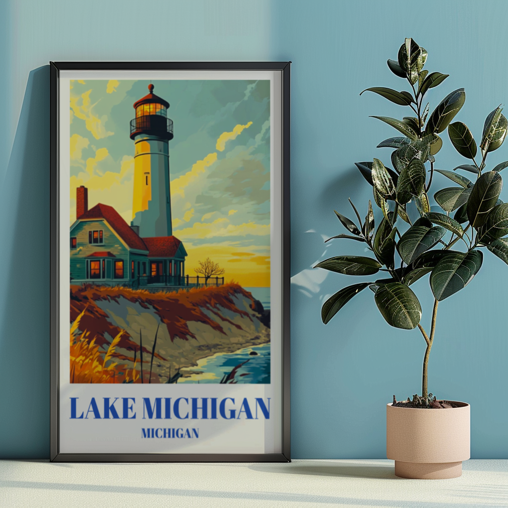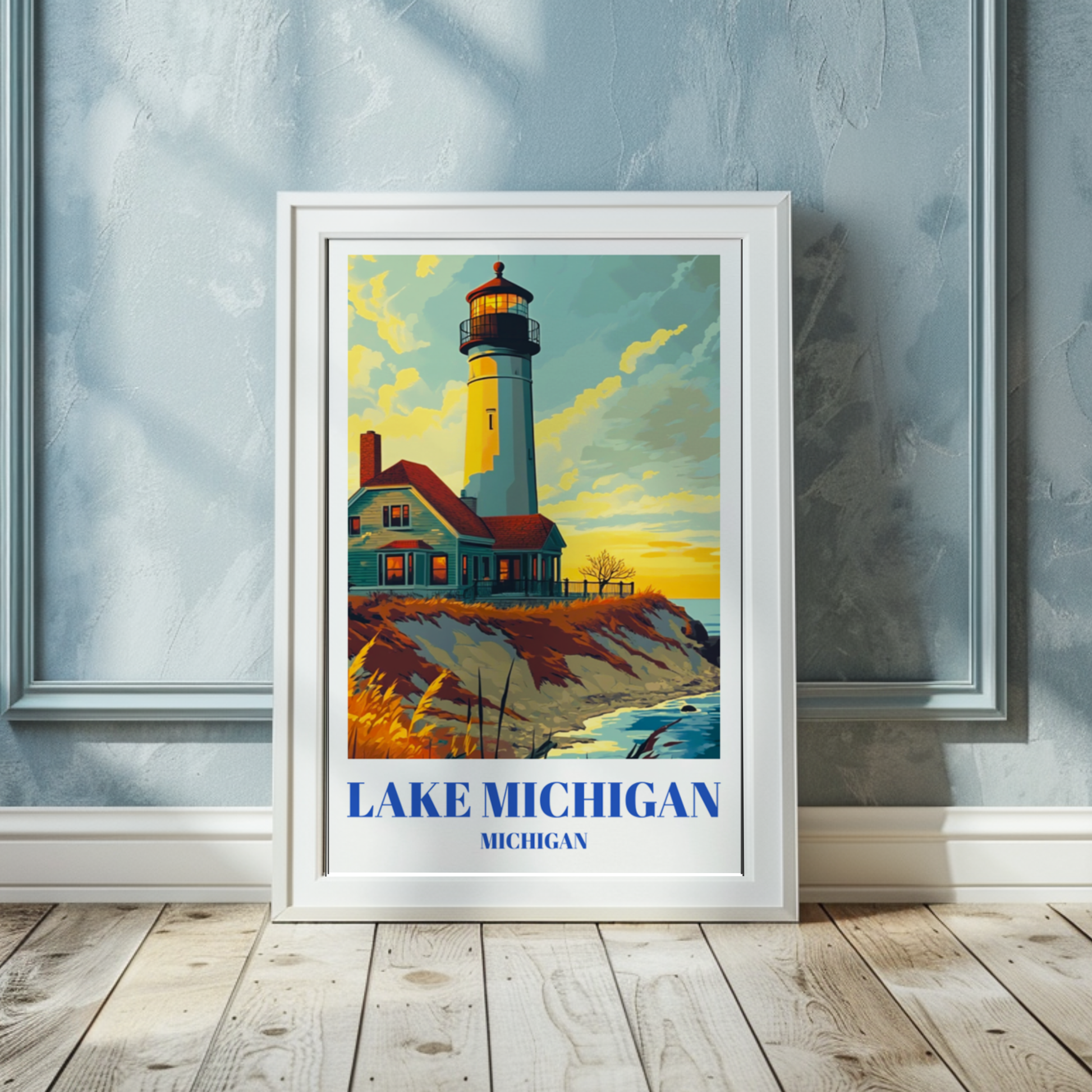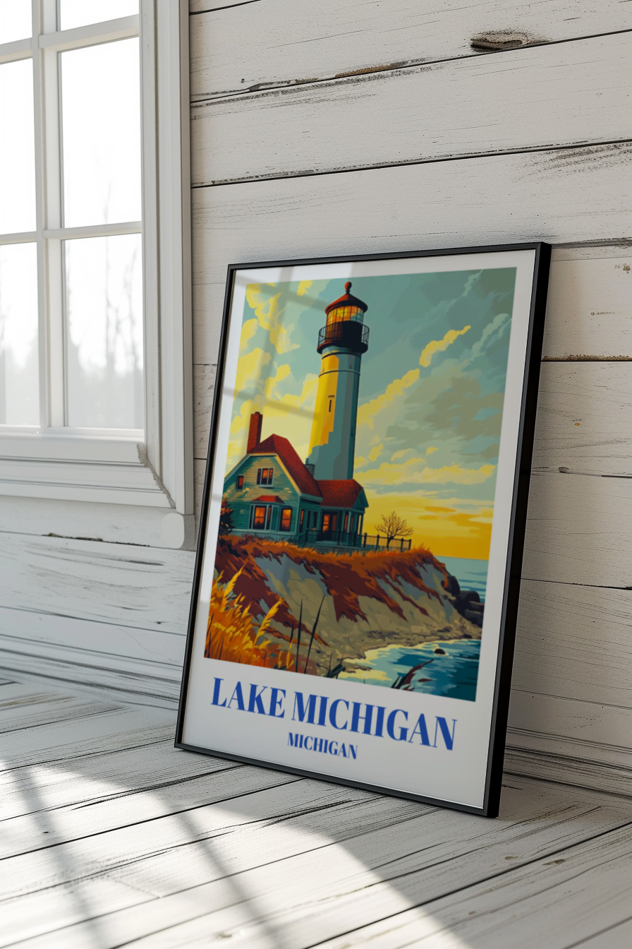 Capture the beauty of the Great Lakes with this stunning Lake Michigan Lighthouse travel poster. Perfect for coastal decor, this high-quality print brings nautical charm to any space, whether it's a beach house, lake cabin, or modern home. Inspired by the iconic lighthouses dotting the Lake Michigan shoreline, this artwork evokes the serene atmosphere of the lakeside. Ideal as a nautical gift, this poster adds a touch of maritime history and classic coastal vibes to your wall decor. Bring the timeless beauty of Lake Michigan into your home today!