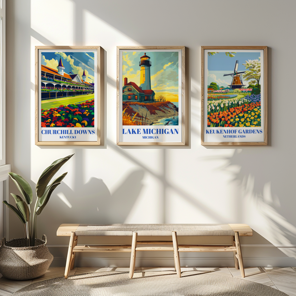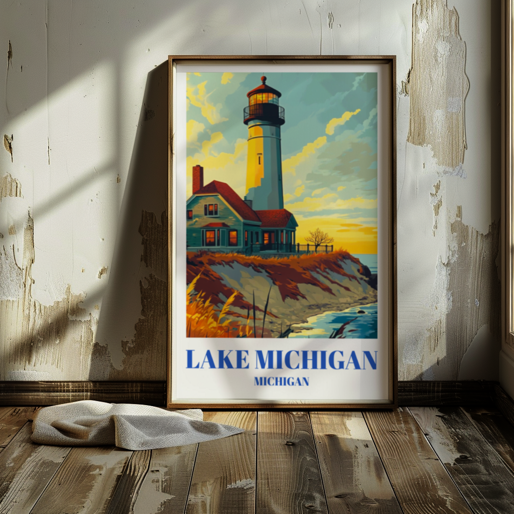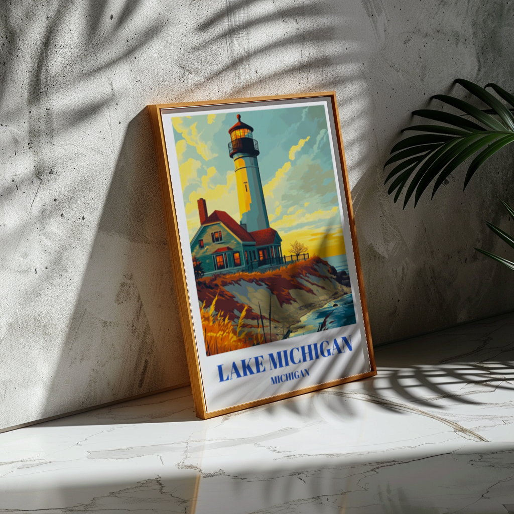 Capture the beauty of the Great Lakes with this stunning Lake Michigan Lighthouse travel poster. Perfect for coastal decor, this high-quality print brings nautical charm to any space, whether it's a beach house, lake cabin, or modern home. Inspired by the iconic lighthouses dotting the Lake Michigan shoreline, this artwork evokes the serene atmosphere of the lakeside. Ideal as a nautical gift, this poster adds a touch of maritime history and classic coastal vibes to your wall decor. Bring the timeless beauty of Lake Michigan into your home today!