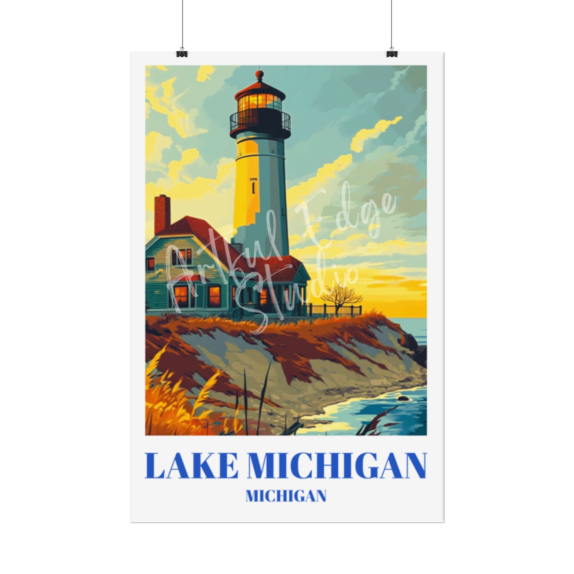 Lake Michigan Lighthouse Travel Poster, Nautical Art Print, Coastal Decor
