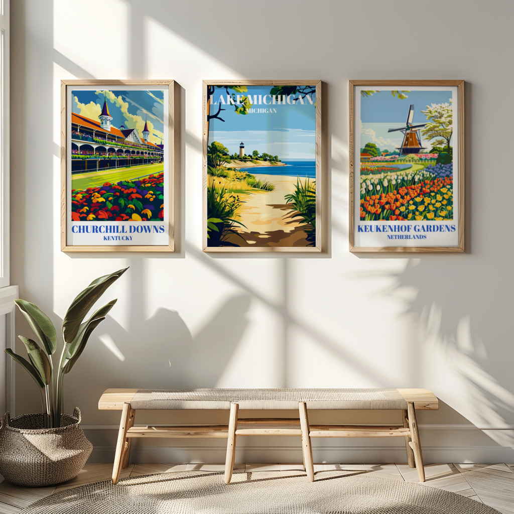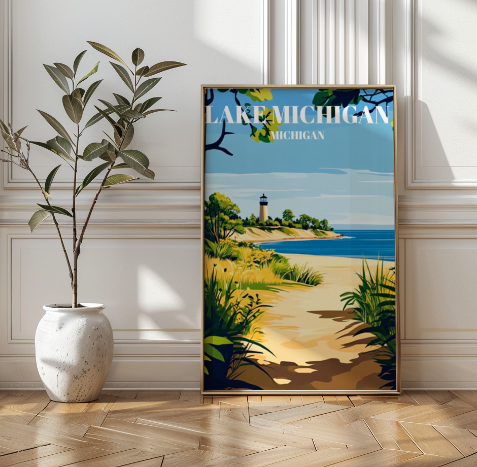 Celebrate the natural beauty of the Great Lakes with this Lake Michigan travel poster. Perfect for coastal home decor, this high-quality print captures the stunning landscapes and serene waters of Lake Michigan, making it ideal for beach house decor, lake cabin walls, or modern home interiors. This poster evokes the peaceful ambiance of the lake’s shoreline, blending perfectly with nautical or nature-inspired decor. Whether as a thoughtful gift or a centerpiece for your own space, bring the scenic charm of Lake Michigan into your home today!