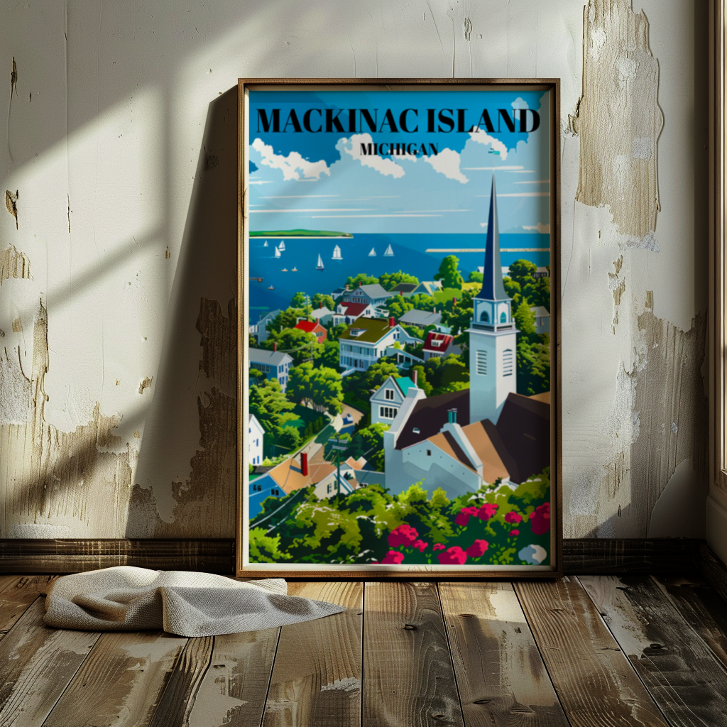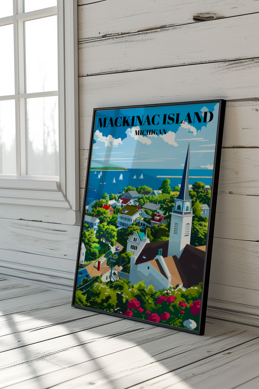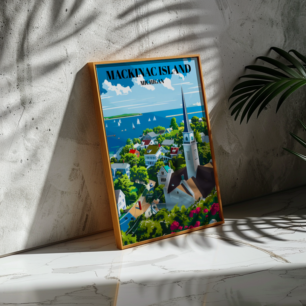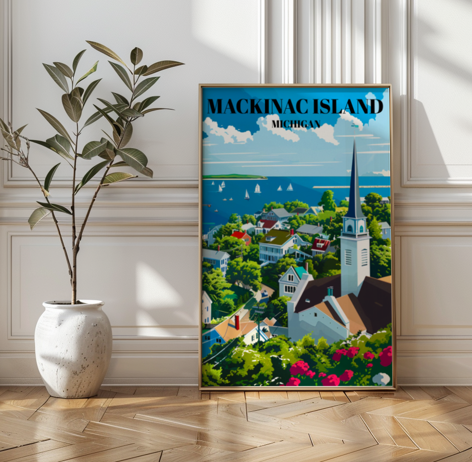 Capture the timeless beauty of Mackinac Island, Michigan, with this stunning travel poster! Featuring the iconic Mackinac Bridge, charming downtown, and serene Lake Huron views, this art print brings Northern Michigan’s scenic charm into your home. Perfect for lovers of Great Lakes decor, retro travel art, and Michigan souvenirs, this poster makes a thoughtful gift for anyone who cherishes island vacations and historic American landmarks. Ideal for home, office, or cottage, this piece celebrates the unique allure of Mackinac Island.