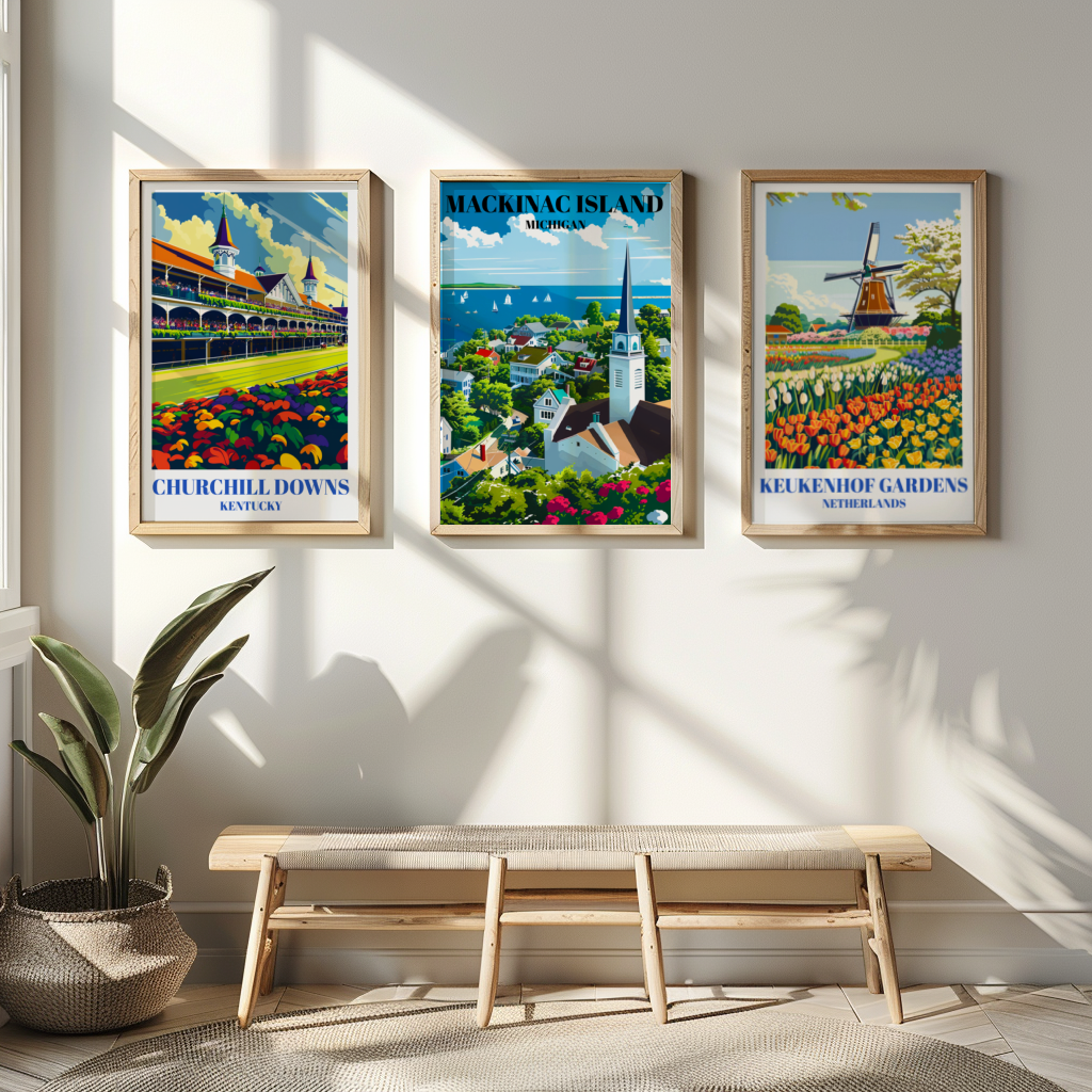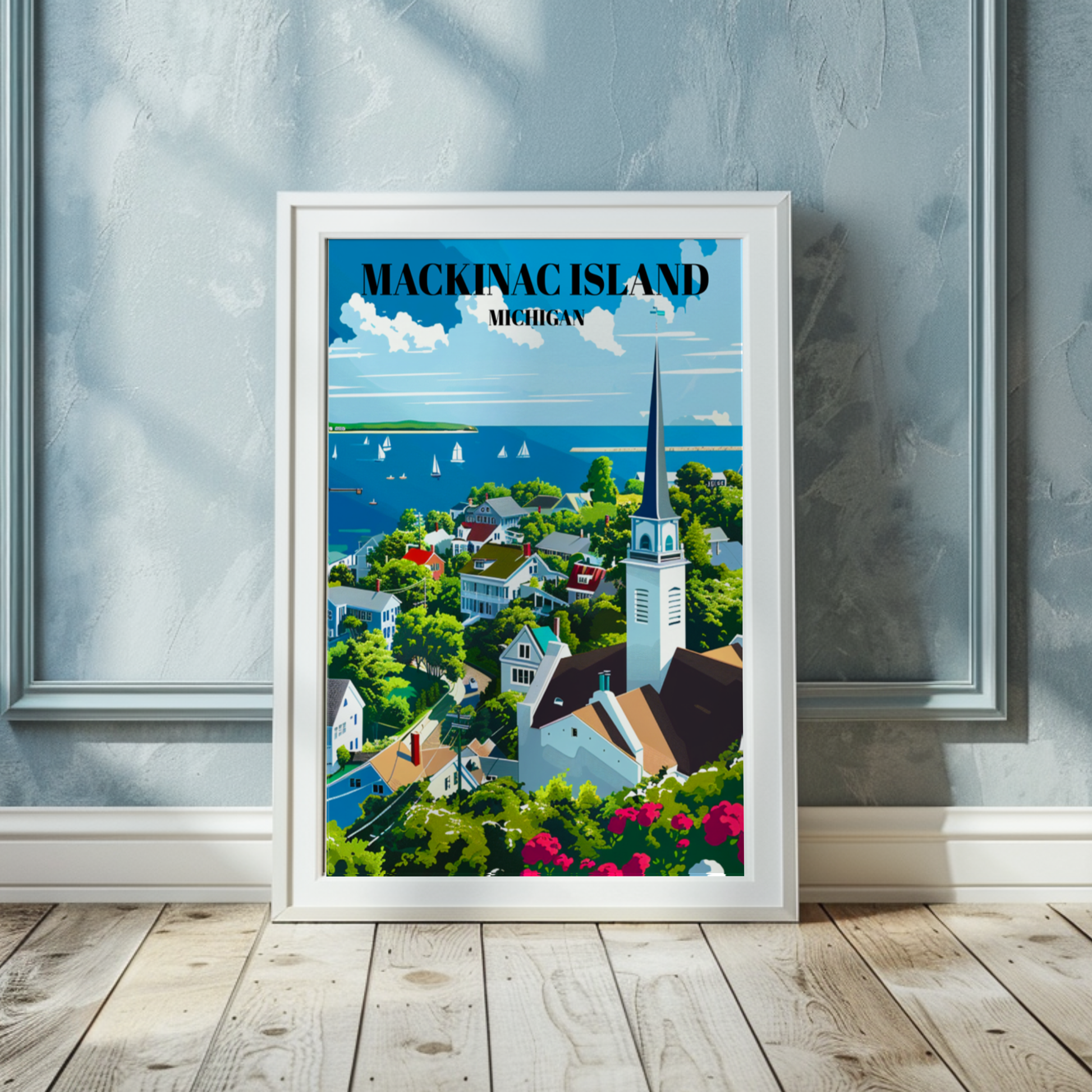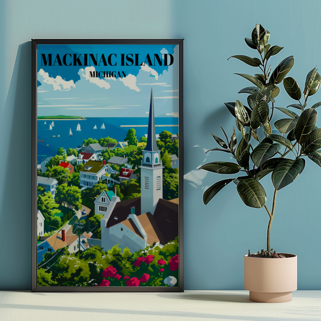 Capture the timeless beauty of Mackinac Island, Michigan, with this stunning travel poster! Featuring the iconic Mackinac Bridge, charming downtown, and serene Lake Huron views, this art print brings Northern Michigan’s scenic charm into your home. Perfect for lovers of Great Lakes decor, retro travel art, and Michigan souvenirs, this poster makes a thoughtful gift for anyone who cherishes island vacations and historic American landmarks. Ideal for home, office, or cottage, this piece celebrates the unique allure of Mackinac Island.