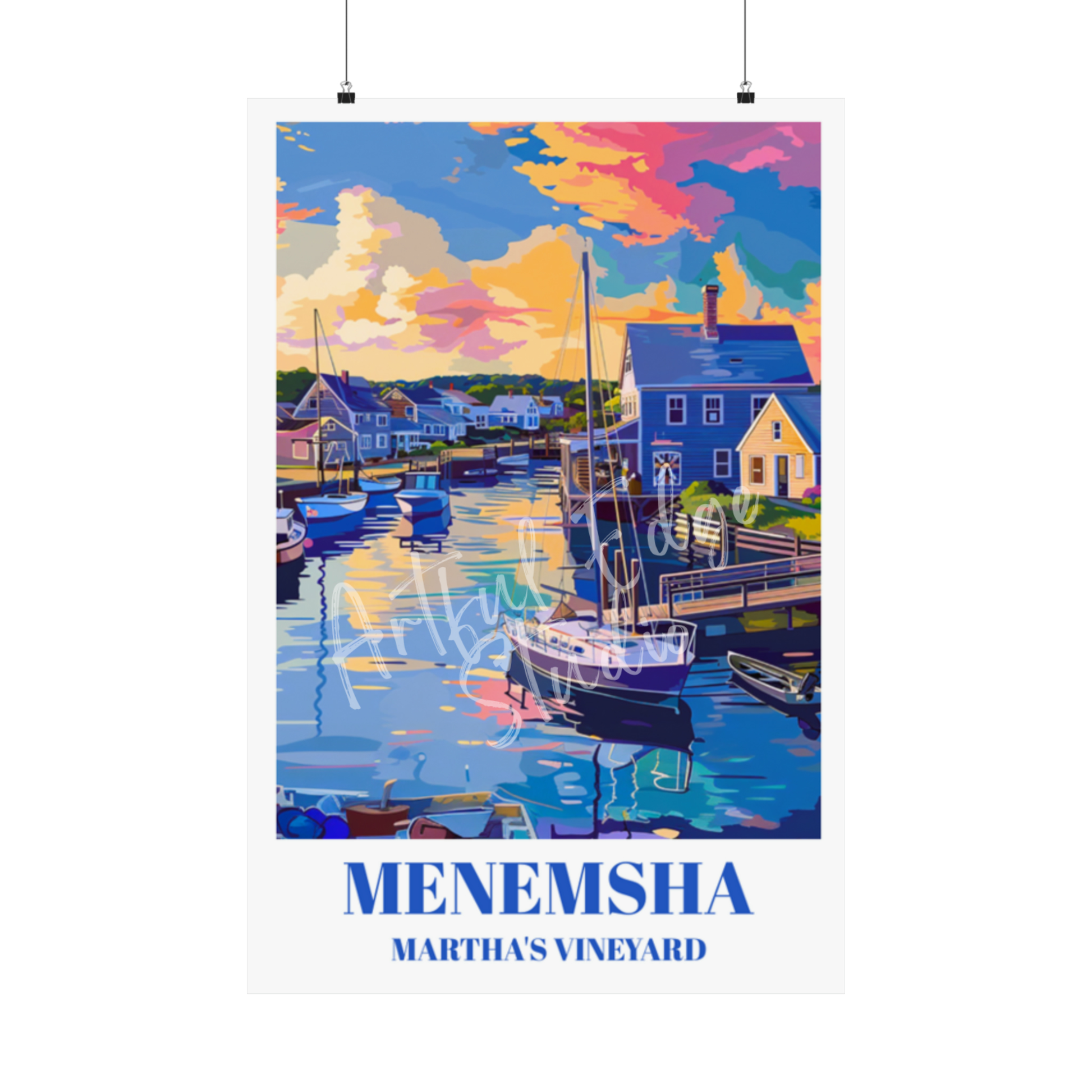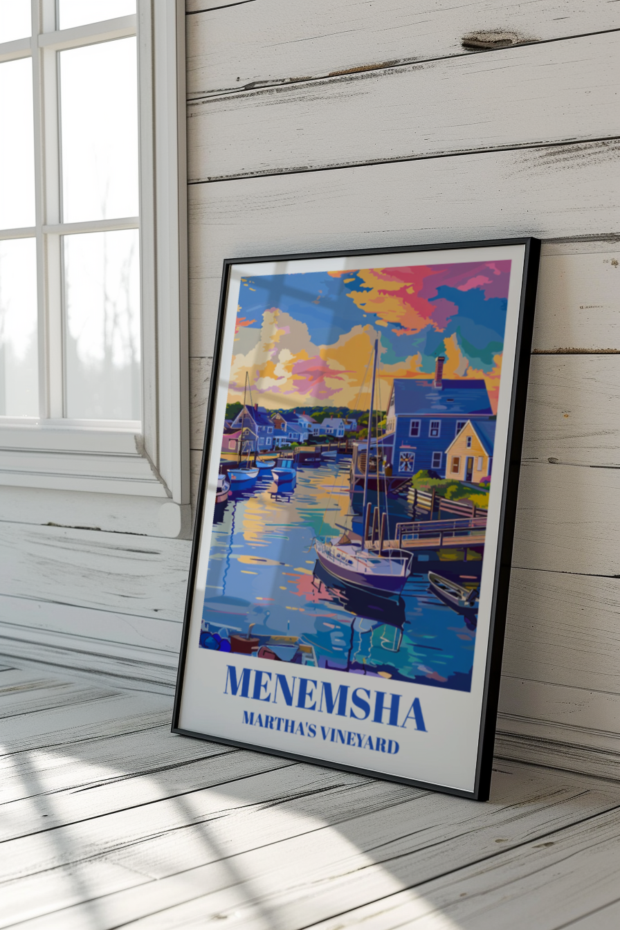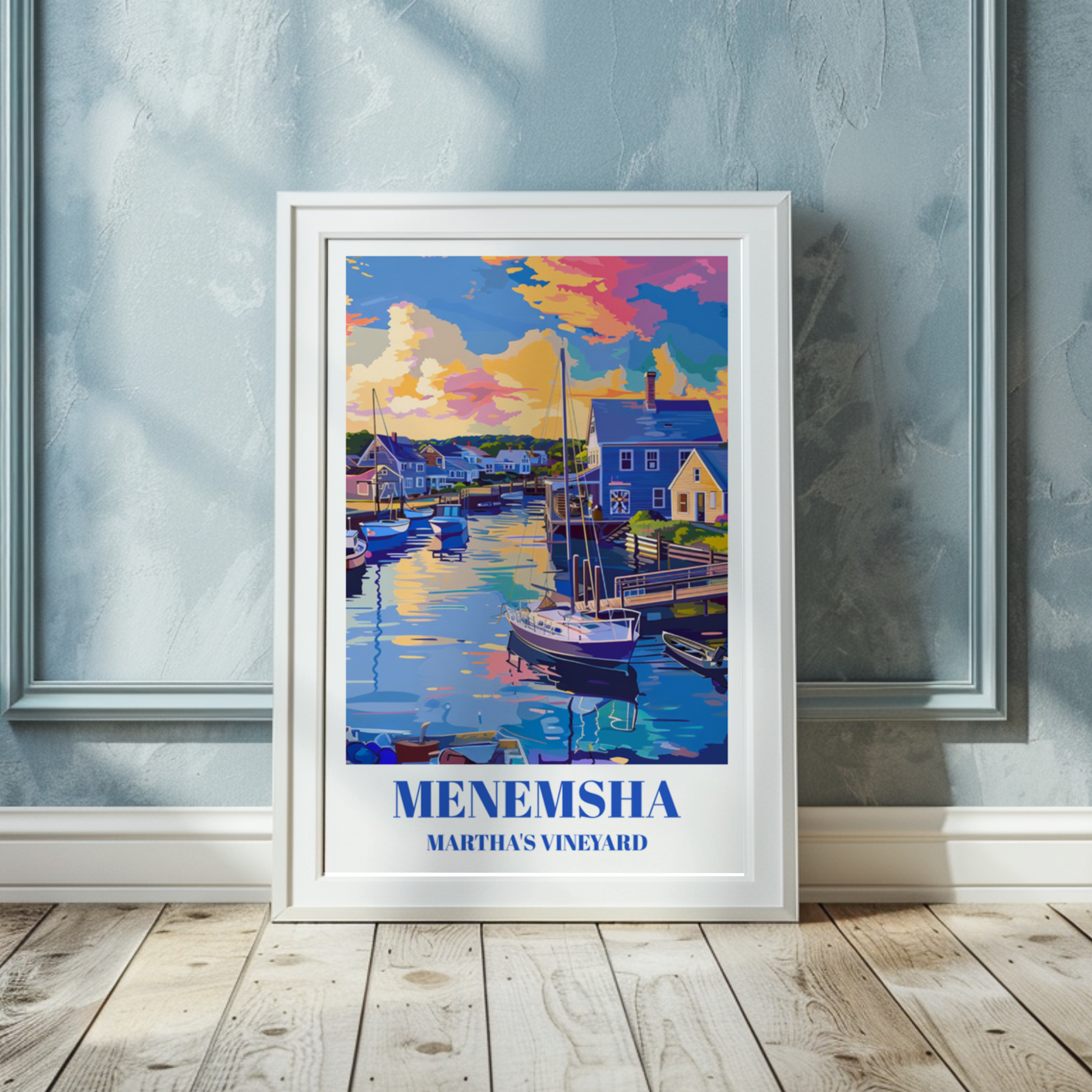 Transport yourself to the idyllic shores of Menemsha Martha's Vineyard with our charming travel poster. Capturing the essence of this picturesque New England coastal village, this vintage-style print is a delightful addition to any wall. Featuring a serene sunset over the iconic Menemsha Harbor, this poster evokes the timeless beauty of Martha's Vineyard. Whether you're a local longing for home or a traveler seeking mementos of your adventures, this artwork is sure to evoke fond memories of sandy beaches, salty air, and lazy summer days. Perfect for beach lovers, nautical enthusiasts, and anyone who cherishes the tranquil charm of coastal living. Add a touch of seaside flair to your home decor or give the gift of coastal nostalgia to a loved one. Printed on high-quality paper, this poster is available in various sizes to suit your space. Bring the magic of Menemsha Martha's Vineyard into your home and let your imagination set sail.