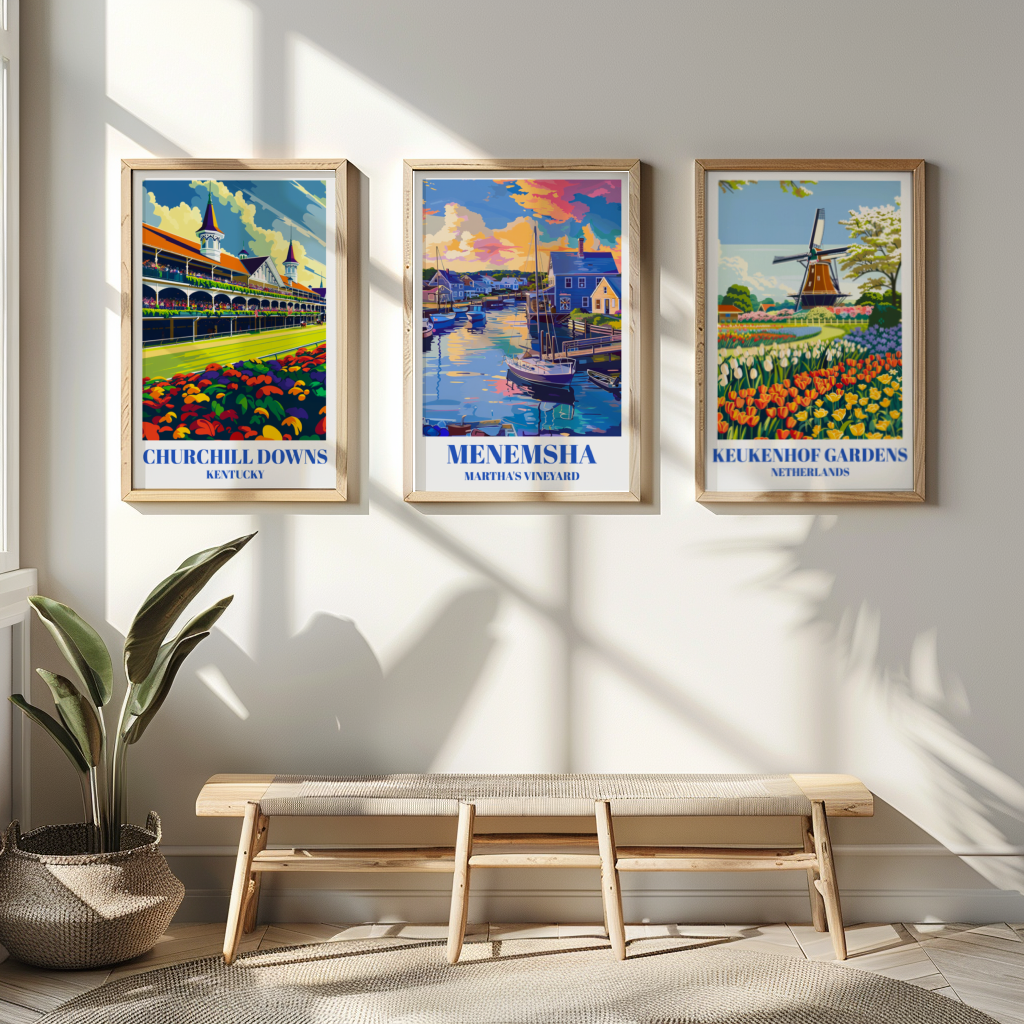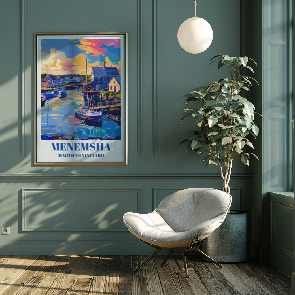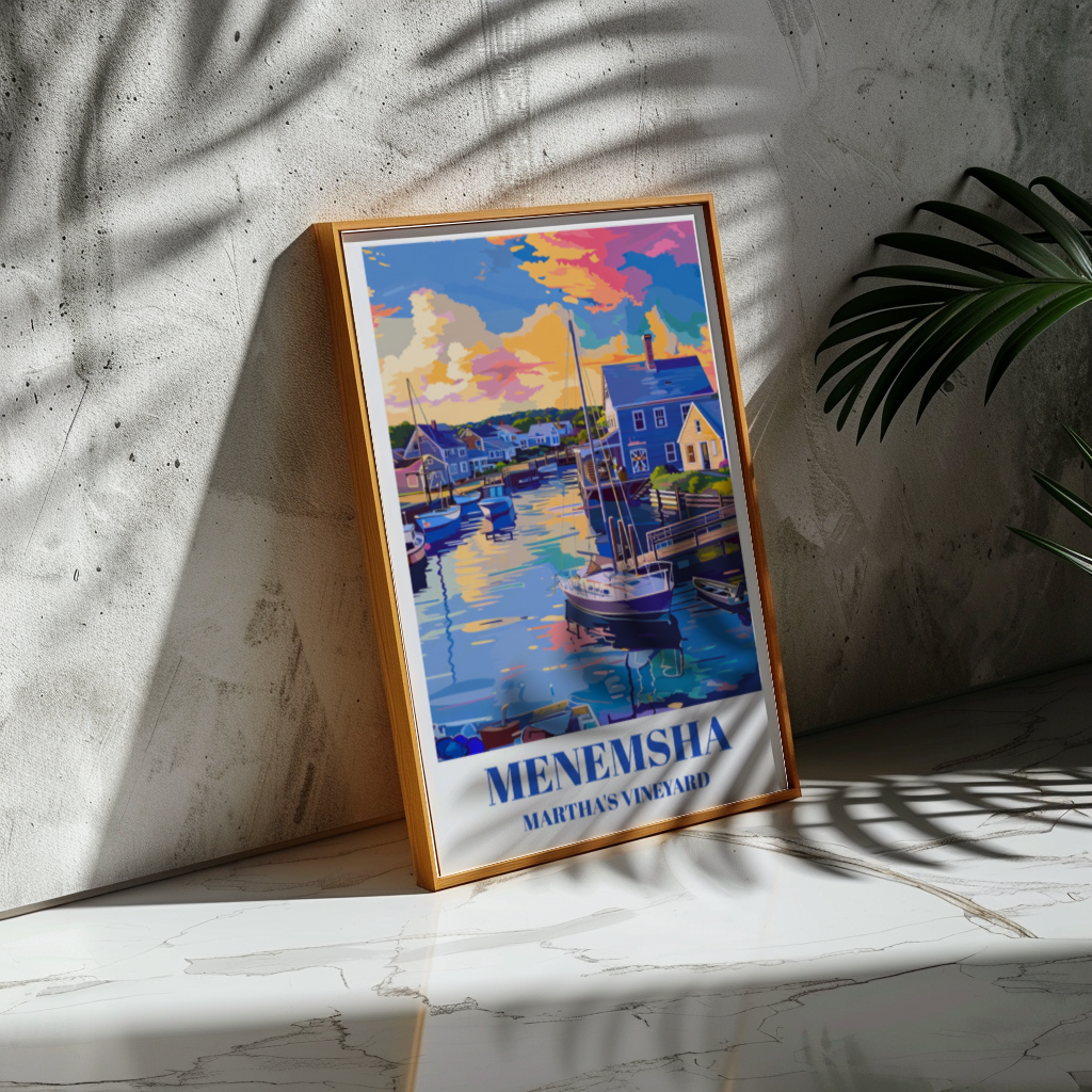Transport yourself to the idyllic shores of Menemsha Martha's Vineyard with our charming travel poster. Capturing the essence of this picturesque New England coastal village, this vintage-style print is a delightful addition to any wall. Featuring a serene sunset over the iconic Menemsha Harbor, this poster evokes the timeless beauty of Martha's Vineyard. Whether you're a local longing for home or a traveler seeking mementos of your adventures, this artwork is sure to evoke fond memories of sandy beaches, salty air, and lazy summer days. Perfect for beach lovers, nautical enthusiasts, and anyone who cherishes the tranquil charm of coastal living. Add a touch of seaside flair to your home decor or give the gift of coastal nostalgia to a loved one. Printed on high-quality paper, this poster is available in various sizes to suit your space. Bring the magic of Menemsha Martha's Vineyard into your home and let your imagination set sail.