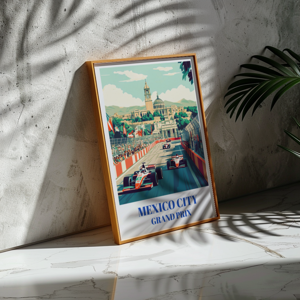 Experience the excitement of the Mexico City Grand Prix with this vibrant travel poster! Featuring the iconic Autódromo Hermanos Rodríguez, this Formula 1 racing art captures the thrilling energy of the F1 circuit in Mexico. Perfect for motorsport enthusiasts, race fans, or as unique wall decor, this print brings the speed and color of the Grand Prix to life. Ideal for home, office, or garage, this poster makes a fantastic gift for any Formula 1 fan. Add a touch of Mexican motorsport spirit to your space with this stunning racing art print today!