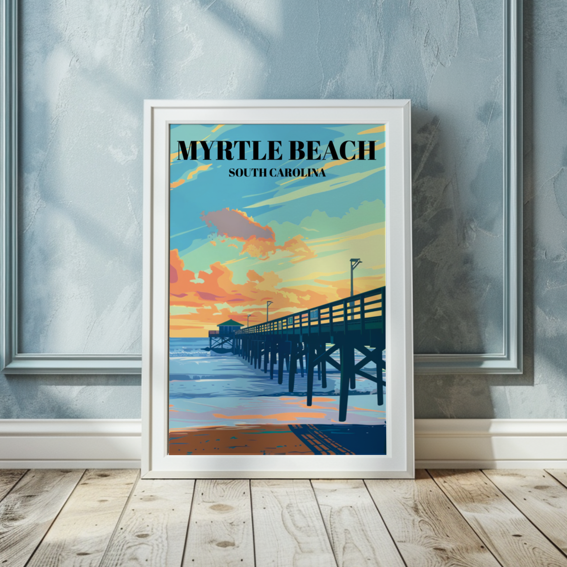 Transport yourself to the tranquil shores of Myrtle Beach State Park, South Carolina, with our captivating travel poster featuring the iconic pier. This vintage-inspired artwork beautifully captures the essence of coastal living, showcasing the majestic pier against the backdrop of the sparkling ocean. Perfect for adding a touch of seaside charm to your home decor, this poster is a nostalgic reminder of sun-soaked days and ocean breezes. Whether you're a beach lover, a travel enthusiast, or simply seeking to infuse your space with coastal vibes, this stunning artwork is sure to delight. Hang it in your living room, bedroom, or office to evoke the serenity and beauty of Myrtle Beach State Park all year round.