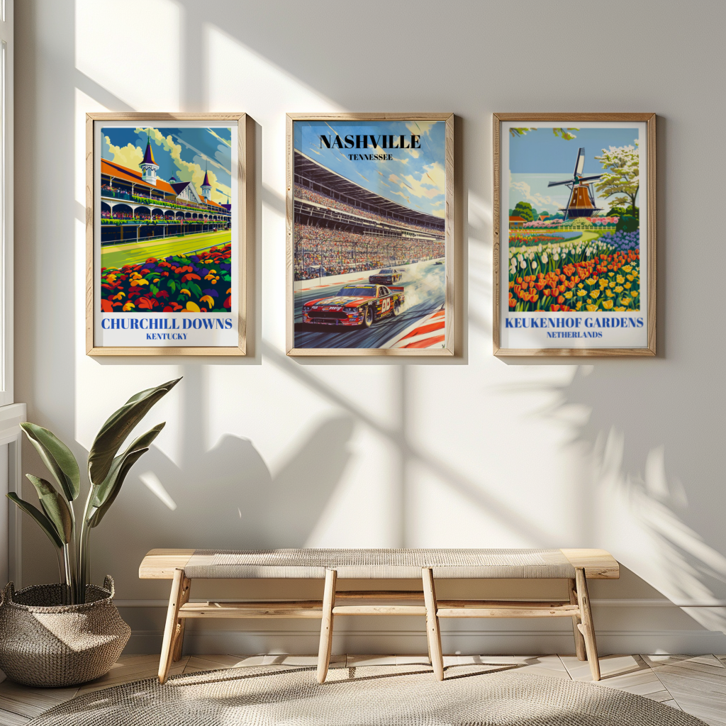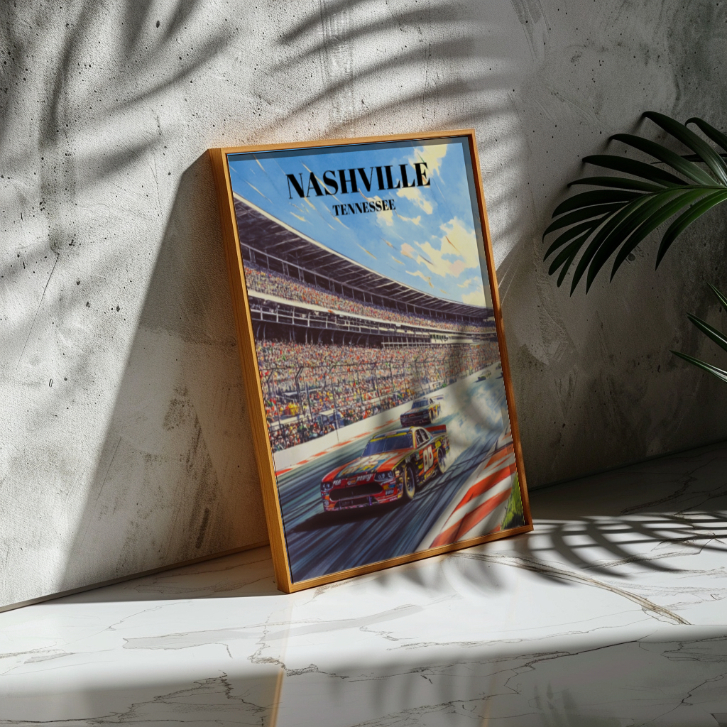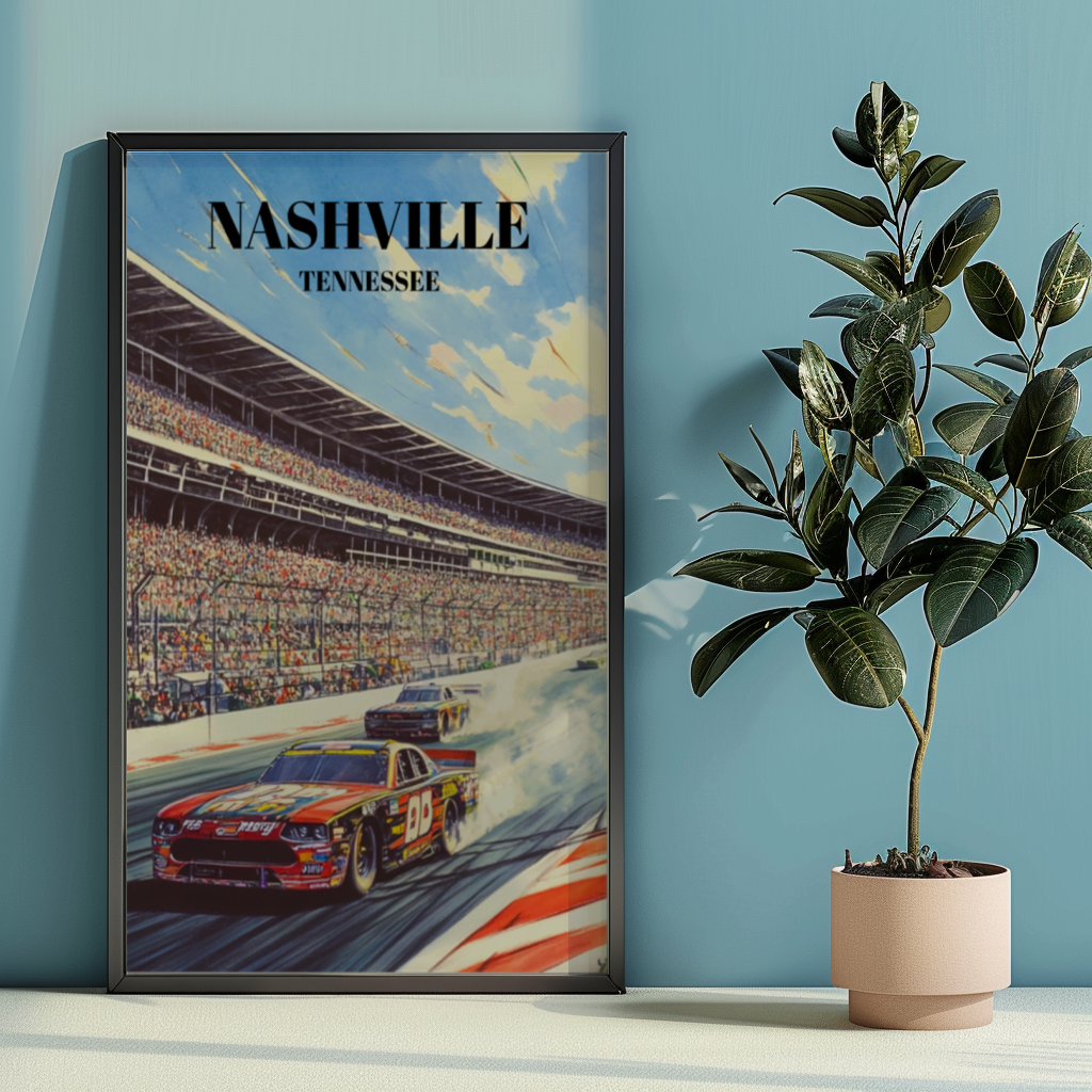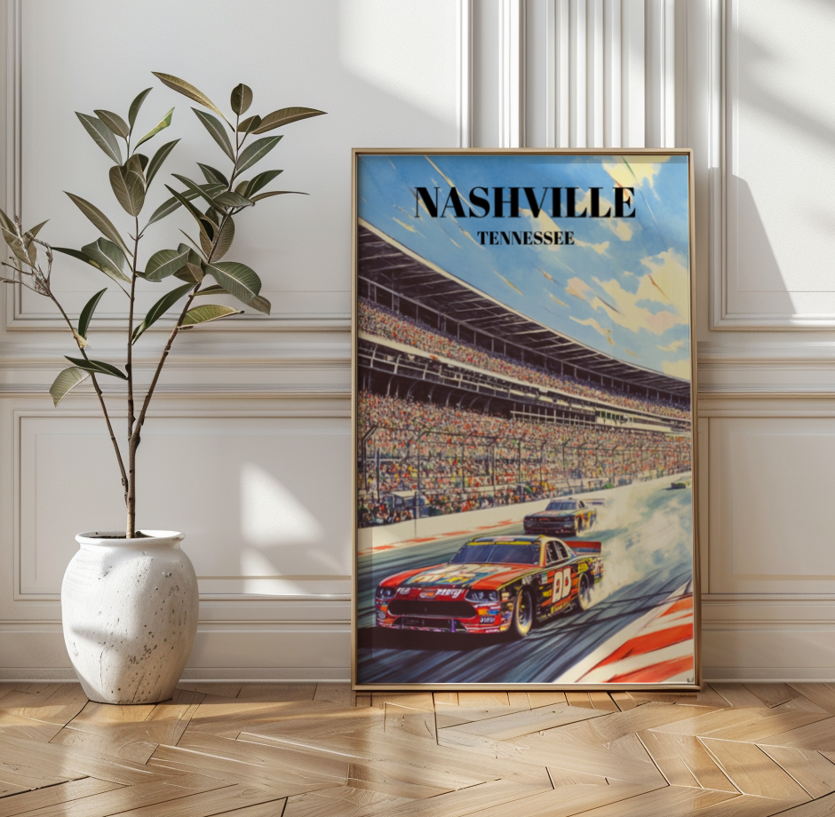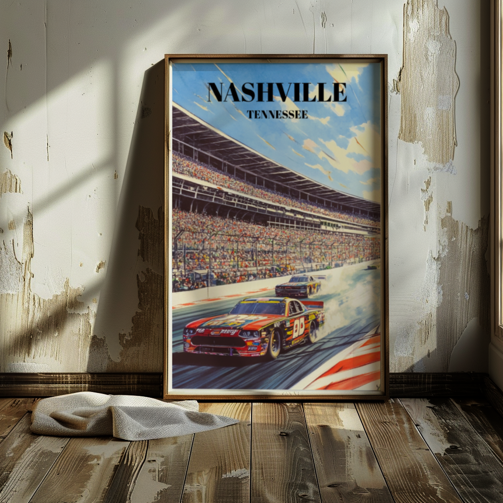 Capture the excitement of Nashville Superspeedway with this vintage-style travel poster, perfect for NASCAR fans, racing enthusiasts, and motorsports lovers. This high-quality print showcases the iconic Tennessee race track, making it a great addition to your man cave, garage, office, or sports bar decor. Whether you're a fan of stock car racing, IndyCar, or high-speed action, this retro racing wall art is a must-have. An ideal gift for race fans, celebrating the thrill of the superspeedway experience!