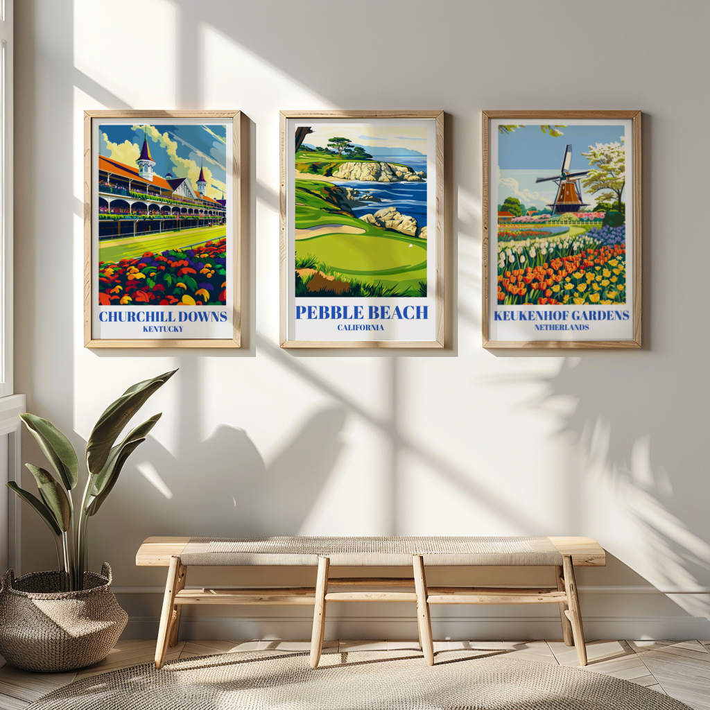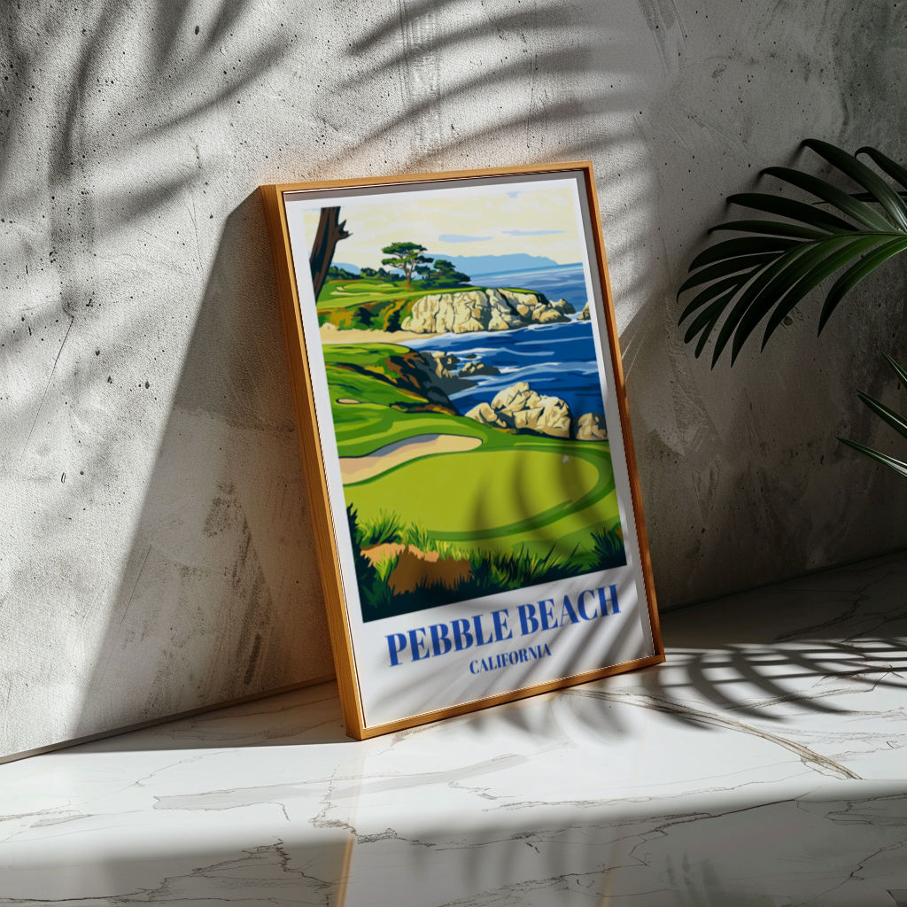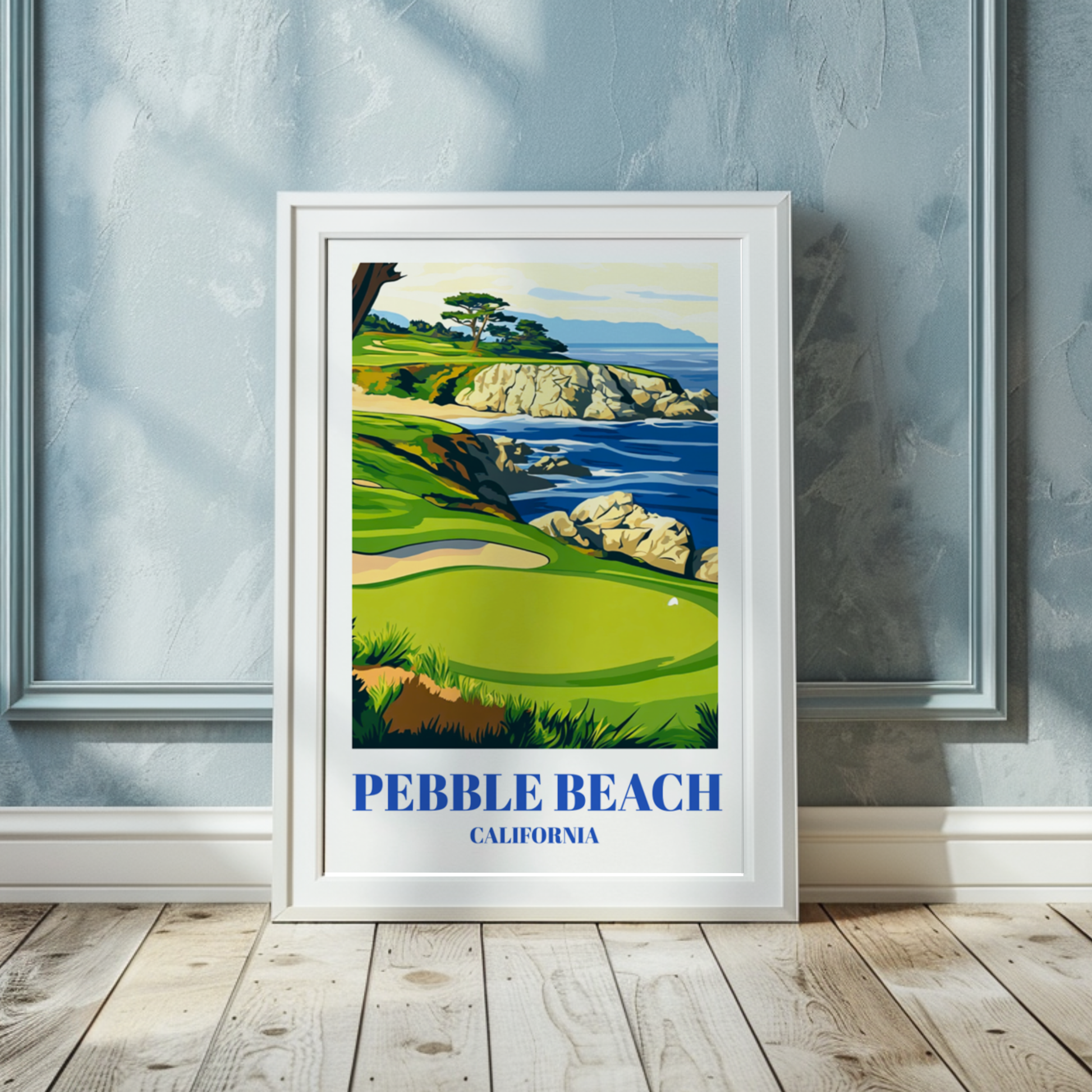 Bring the beauty of Pebble Beach Golf Course in Monterey, California to your home with this stunning travel poster. Featuring the iconic coastal landscapes and world-renowned golf destination, this artwork is perfect for golf enthusiasts and lovers of California's scenic charm. Ideal for wall decor in offices, living rooms, or man caves, it also makes a thoughtful gift. Printed in high-quality detail, this vintage-style art celebrates the elegance of Pebble Beach, Monterey Bay, and its unforgettable Pacific Ocean views.