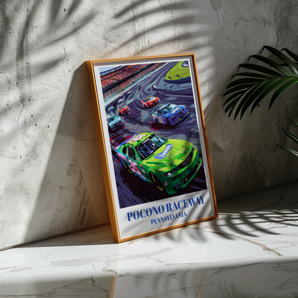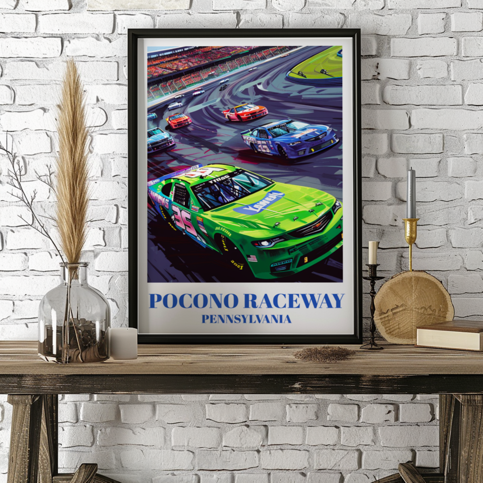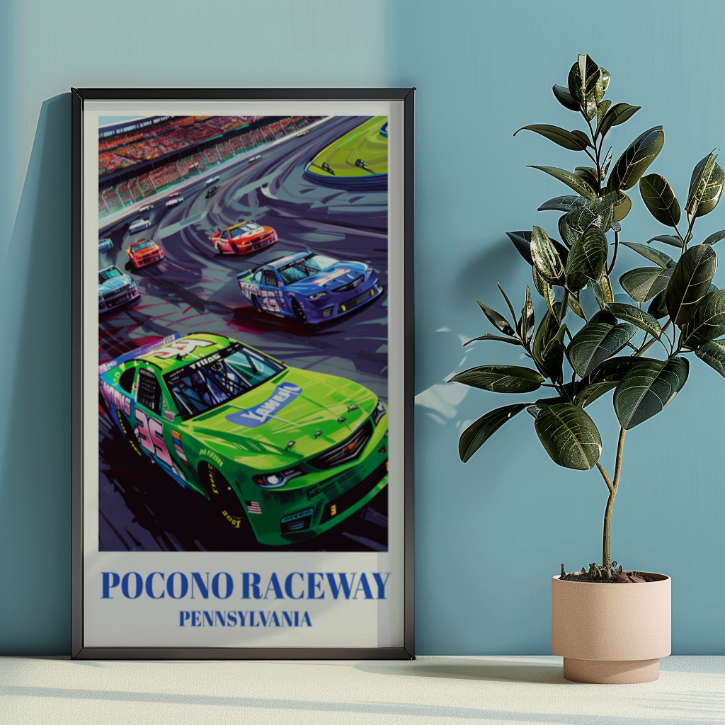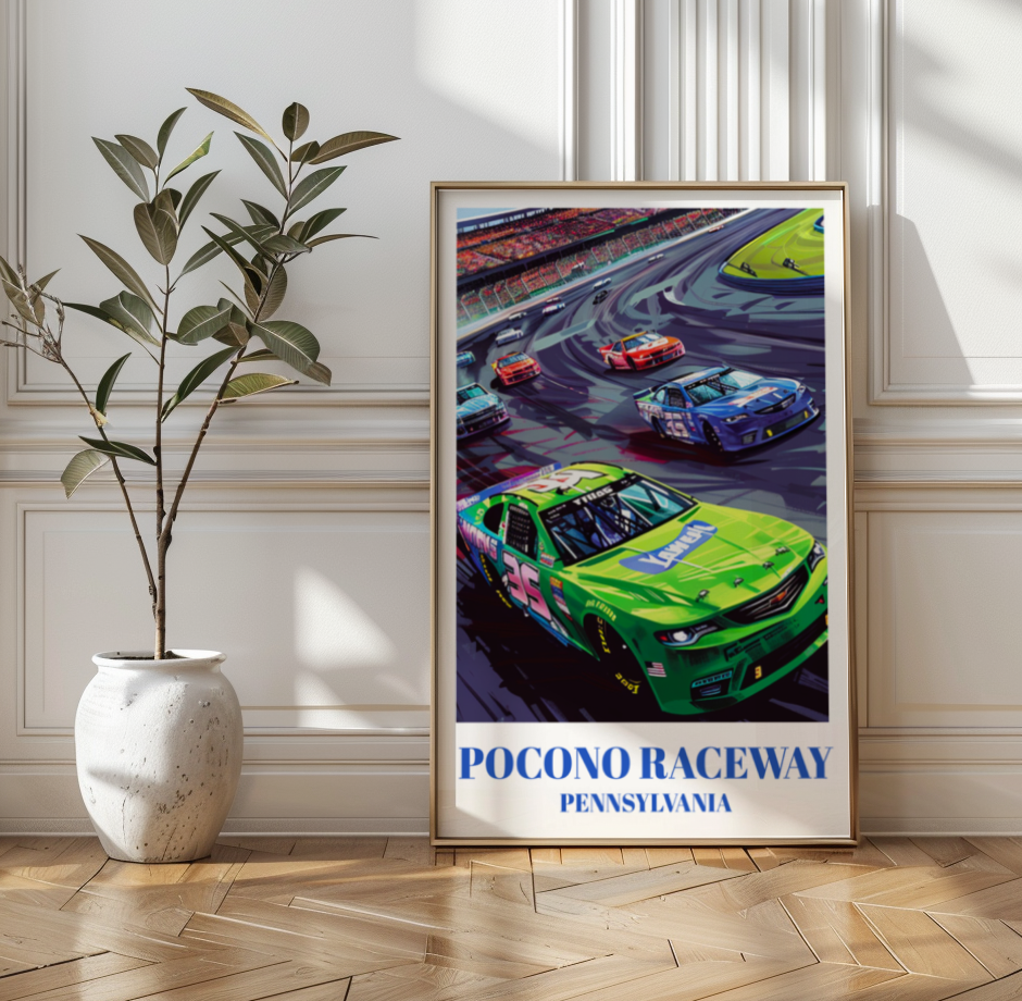 Capture the thrill of NASCAR with this stunning travel poster of Pocono Raceway, viewed from the stands! Perfect for any racing enthusiast, this vintage-style wall art print showcases the iconic Pocono 500 track in all its glory. Ideal as a gift for NASCAR fans, car lovers, and collectors of racing memorabilia, this unique decor piece brings the excitement of motor racing right into your home. Hang it in your living room, office, or man cave to celebrate the historic Pennsylvania speedway. Add this collectible NASCAR souvenir to your decor and relive the high-speed action every day!