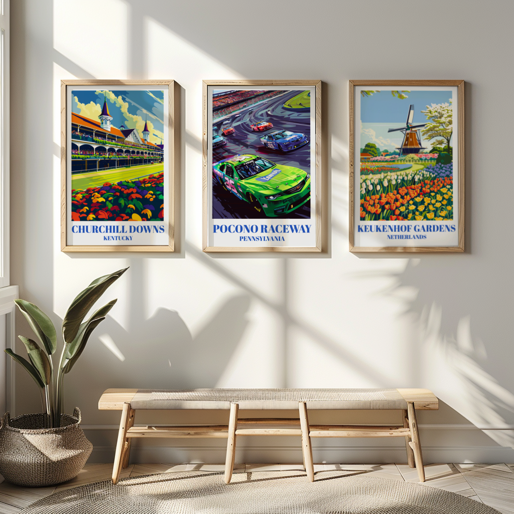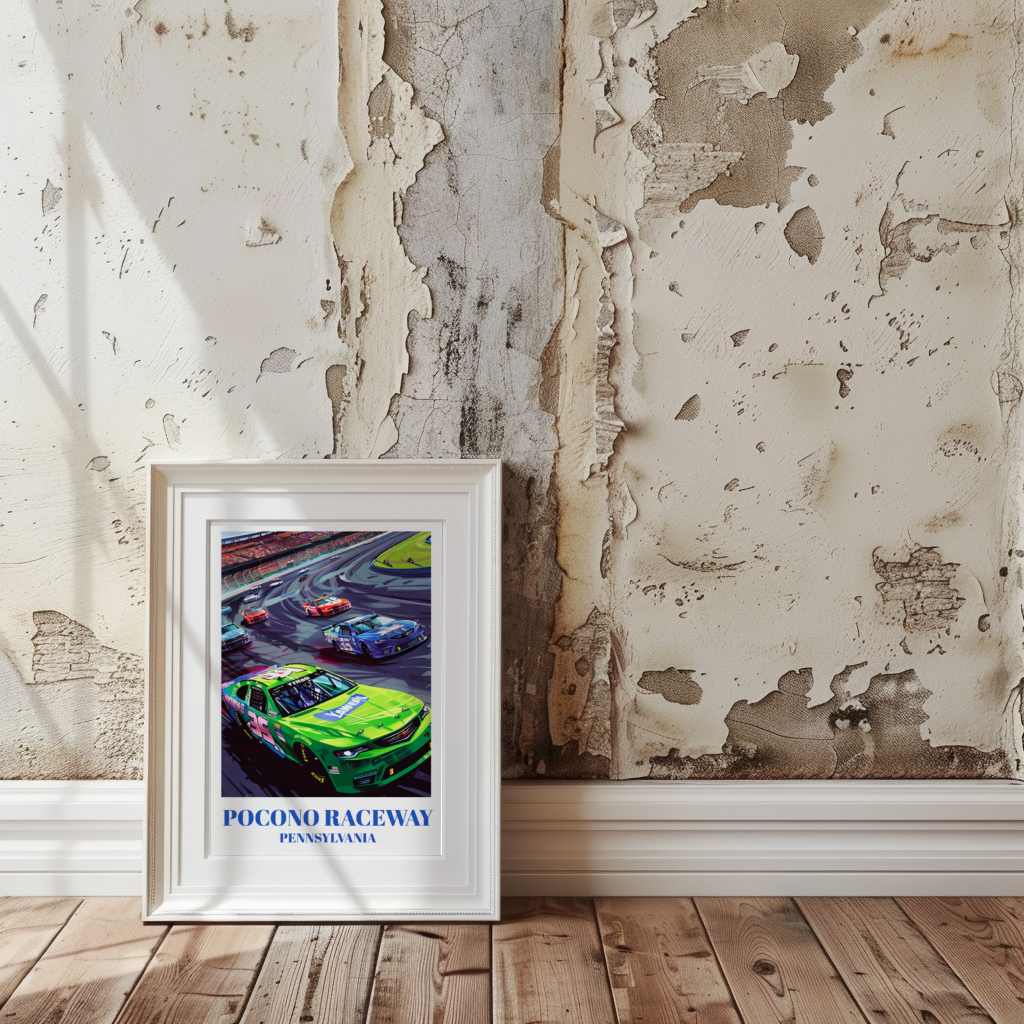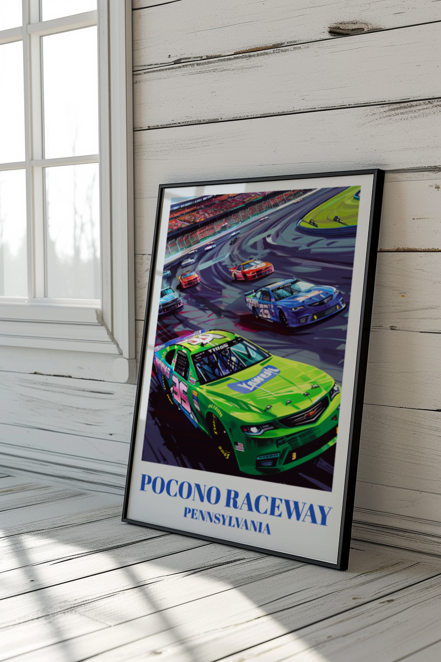Capture the thrill of NASCAR with this stunning travel poster of Pocono Raceway, viewed from the stands! Perfect for any racing enthusiast, this vintage-style wall art print showcases the iconic Pocono 500 track in all its glory. Ideal as a gift for NASCAR fans, car lovers, and collectors of racing memorabilia, this unique decor piece brings the excitement of motor racing right into your home. Hang it in your living room, office, or man cave to celebrate the historic Pennsylvania speedway. Add this collectible NASCAR souvenir to your decor and relive the high-speed action every day!