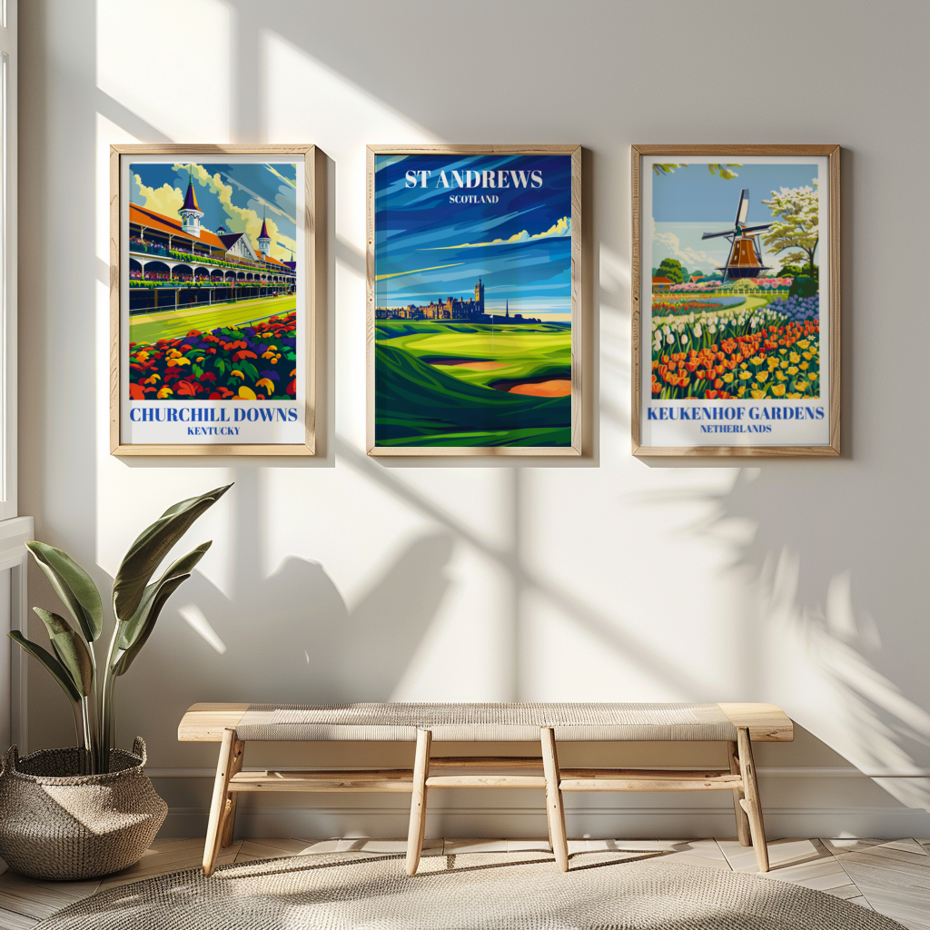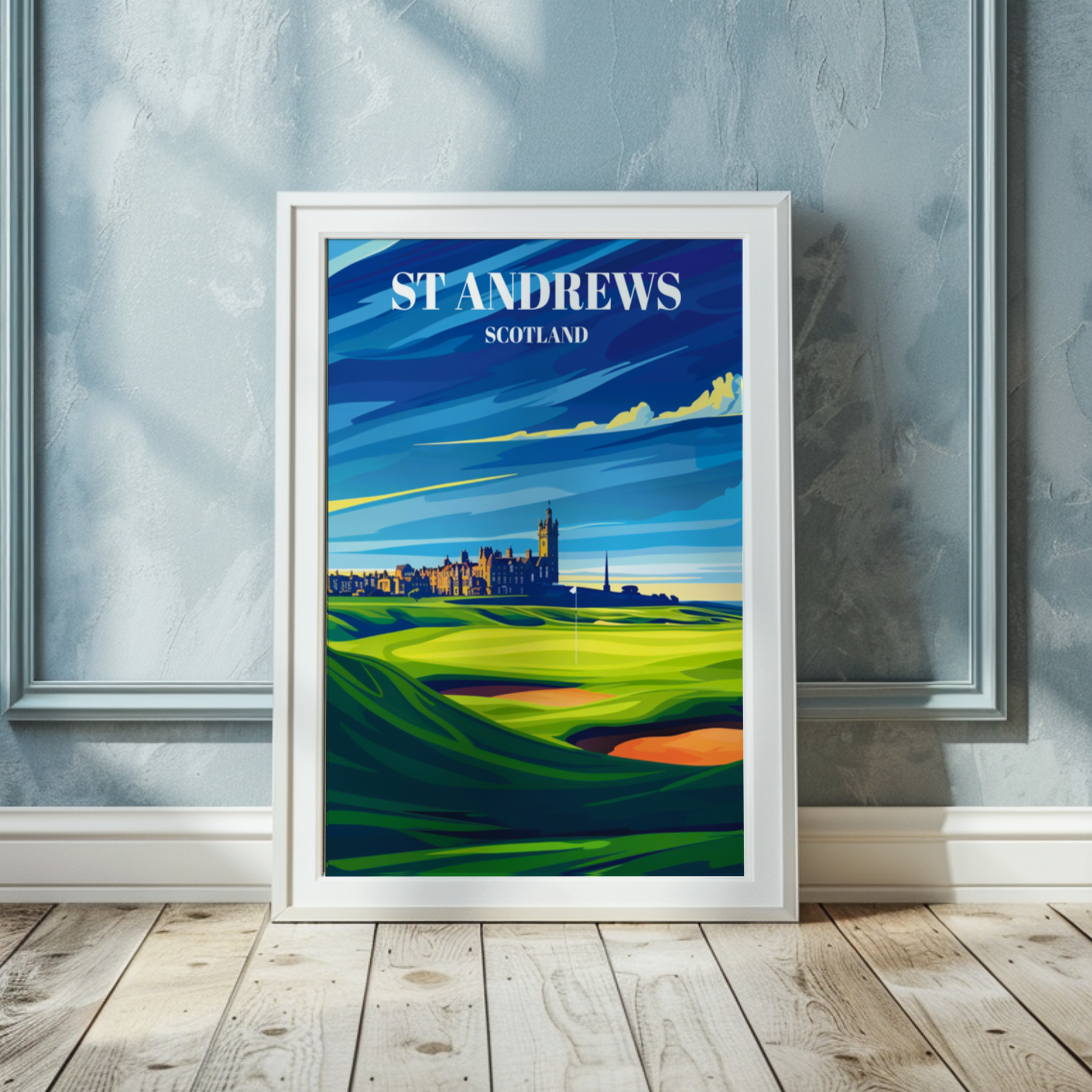 Embark on a journey to the legendary St. Andrews Links in Scotland with our captivating poster print. Admire the sweeping vistas of the oldest golf course in the world, steeped in centuries of tradition and prestige. Our artwork beautifully captures the rolling fairways, rugged coastline, and historic landmarks that define this iconic destination. Whether you're an avid golfer, a fan of Scottish landscapes, or simply seeking a unique piece of wall art, our St. Andrews Links poster is sure to delight. Printed on high-quality archival paper, this poster is a timeless tribute to the allure of golfing history and the natural beauty of Scotland's shores. Add a touch of sporting elegance to your home, office, or clubhouse with this evocative artwork that celebrates the spirit of St. Andrews. Perfect as a gift for golf enthusiasts, travelers, or anyone who appreciates the charm of Scotland's most renowned golf course. Let our poster transport you to the fairways of St. Andrews, where legends are made and memories are forged.
