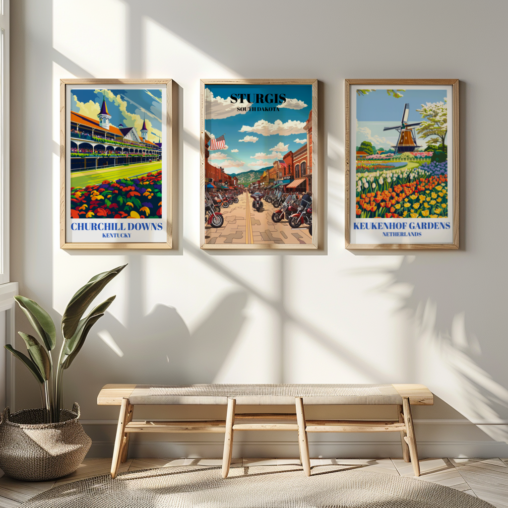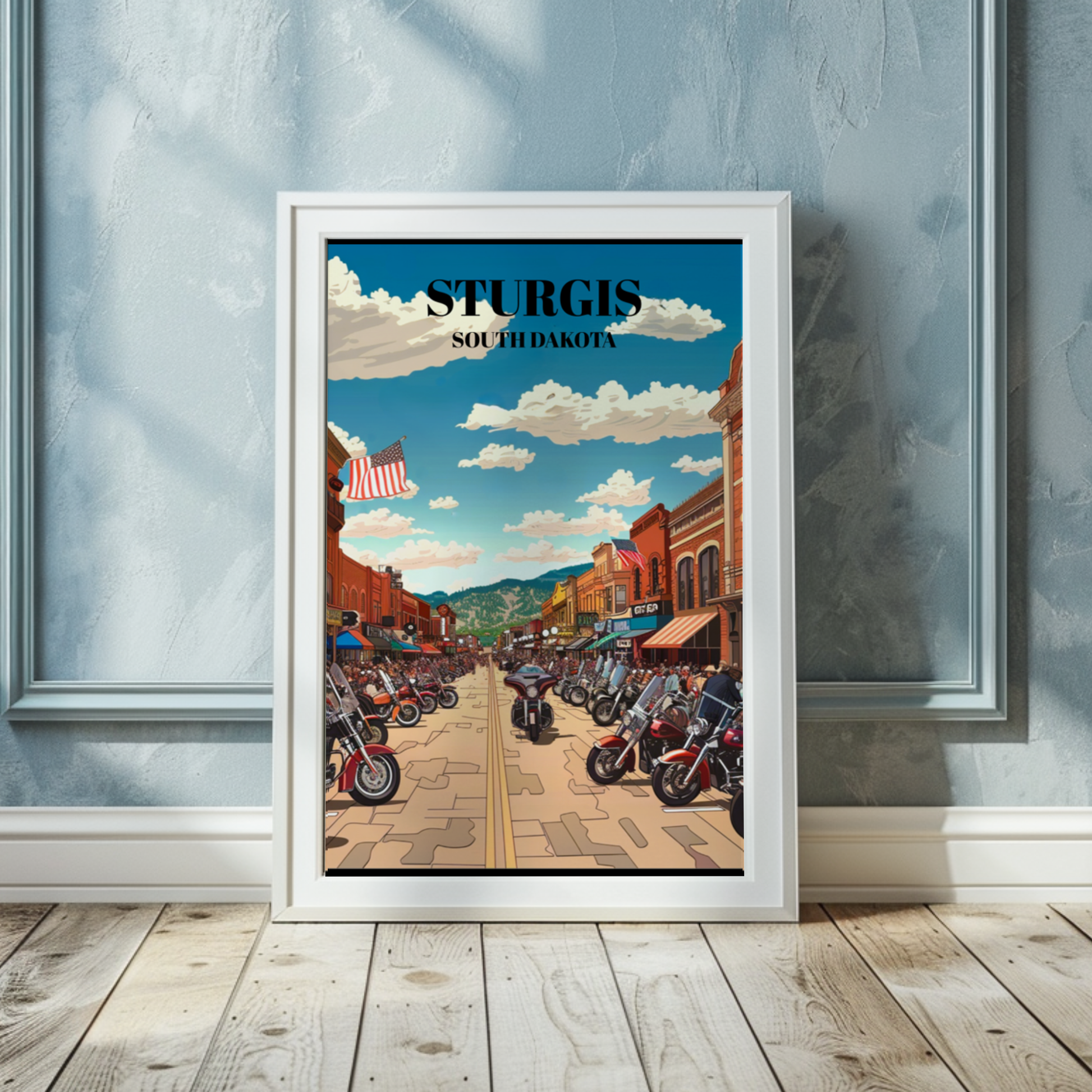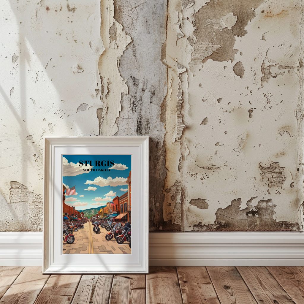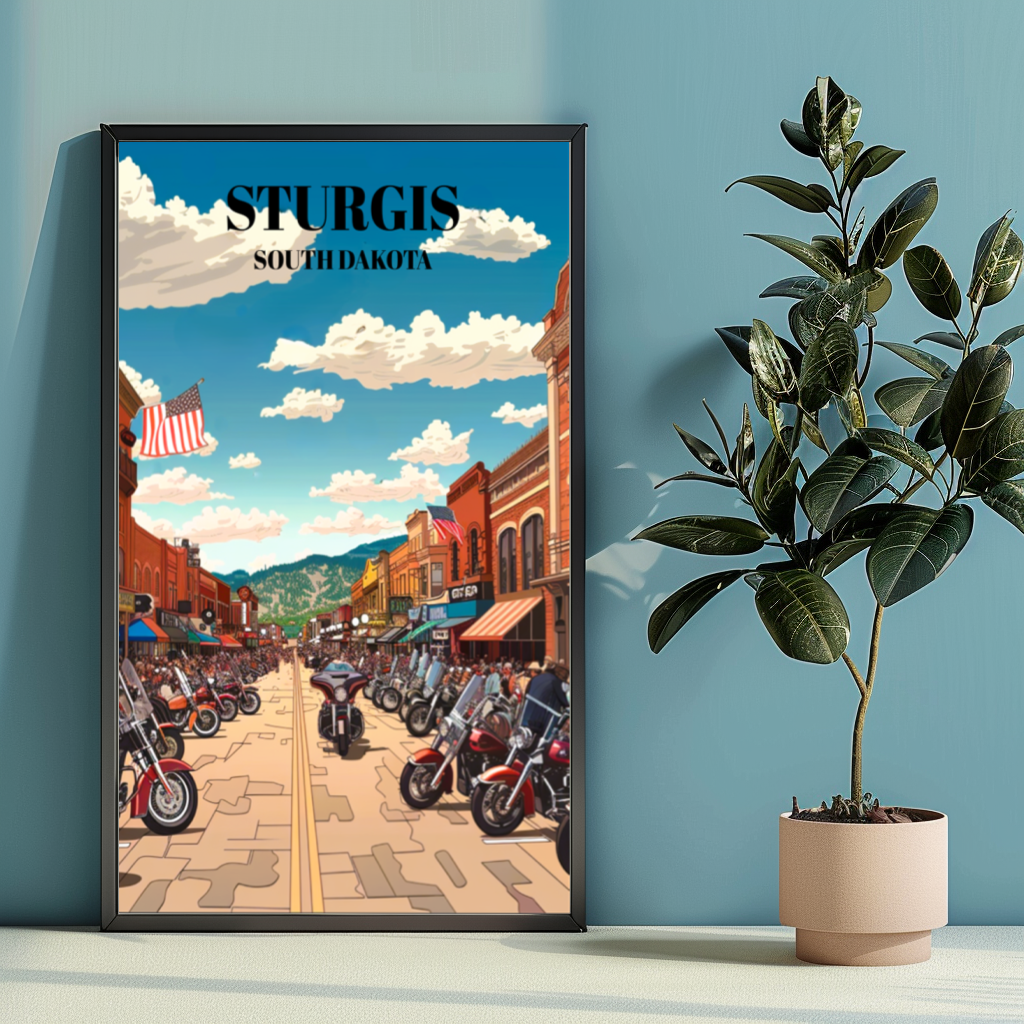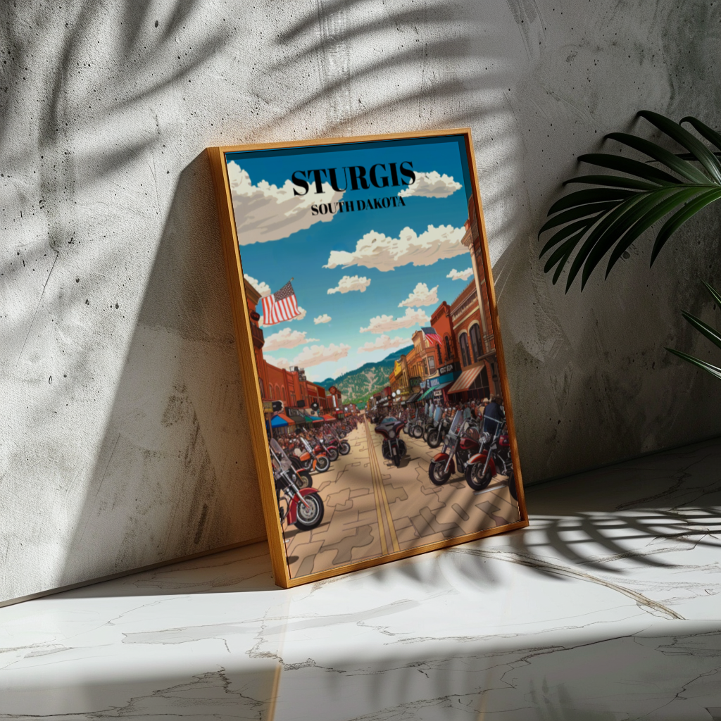Step into the roaring heart of American motorcycle culture with our captivating Sturgis, South Dakota Bike Week travel poster. Crafted with vintage flair, this art print captures the essence of the legendary event, showcasing the thrilling ambiance of bikers converging on the historic town. Feel the rumble of Harley Davidsons as they thunder through the streets, mingling with the spirited camaraderie of riders from all walks of life. Our poster is more than just decor; it's a testament to the freedom of the open road, the thrill of adventure, and the indomitable spirit of the biker community. Hang it proudly in your home, office, or garage to relive the excitement of Bike Week year-round. Whether you're a seasoned rider, a fan of motorcycle culture, or simply a lover of Americana, this poster is sure to evoke nostalgia and ignite your wanderlust. It's the perfect addition to any collection of motorcycle memorabilia or vintage travel art. Embrace the spirit of the road and bring a piece of Sturgis Bike Week into your space today!