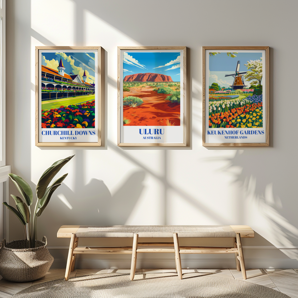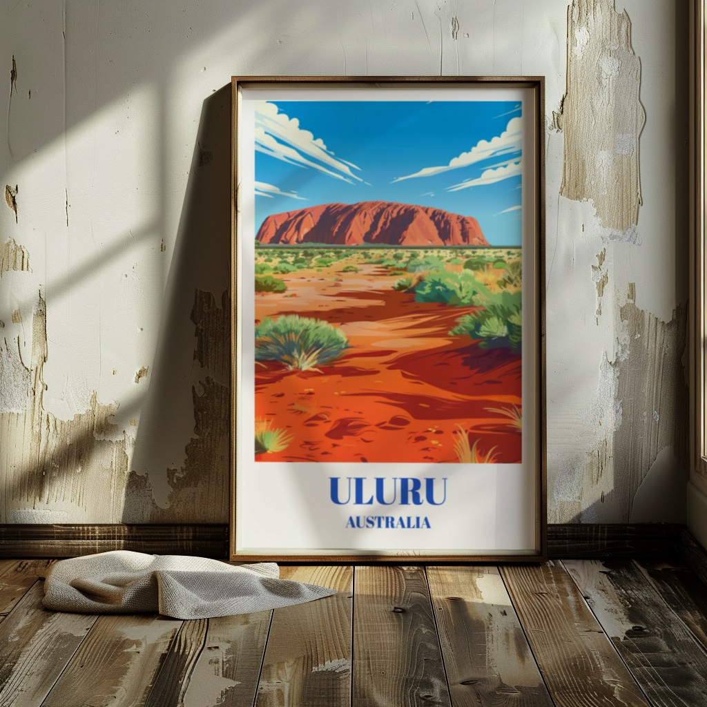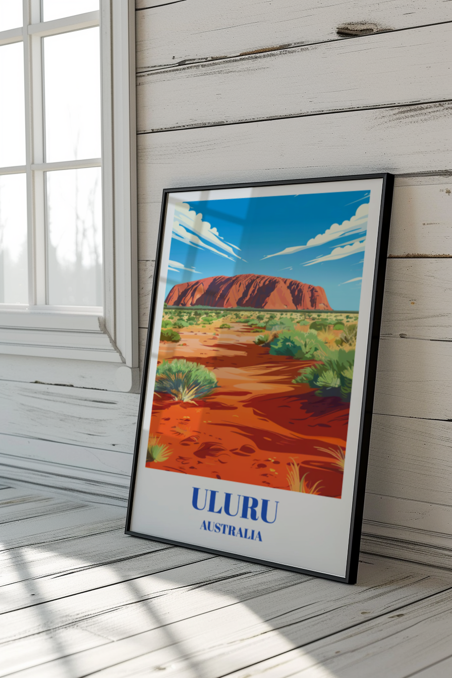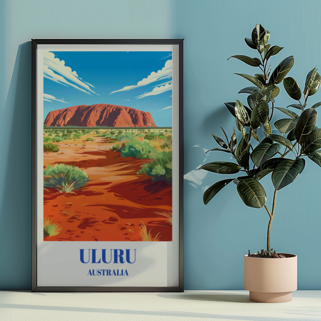 This meticulously designed poster brings the essence of the Outback into any space, from living rooms to offices, with its rich colors and detailed depiction of Uluru's unique silhouette. Its vintage aesthetic adds a touch of nostalgia and wanderlust, evoking a sense of adventure and exploration. Uluru holds deep cultural significance for Indigenous Australians, and this poster honors that heritage while also celebrating the natural wonder of the site. It serves as a reminder of the importance of preserving and appreciating the beauty of our planet's diverse landscapes. Crafted with high-quality materials, this poster is not just a decorative piece but a conversation starter and a reminder of the power and majesty of nature. It makes for a meaningful gift for travelers, nature enthusiasts, or anyone with a love for Australia and its remarkable landscapes. Hang it in your home or office to add a touch of wanderlust to your surroundings and inspire your next adventure. Whether you've visited Uluru before or dream of exploring it one day, this travel poster captures the essence of the Outback and invites you to embark on a journey of discovery and appreciation for the natural world.