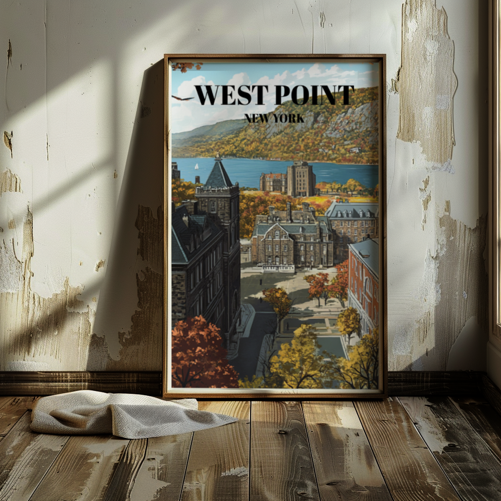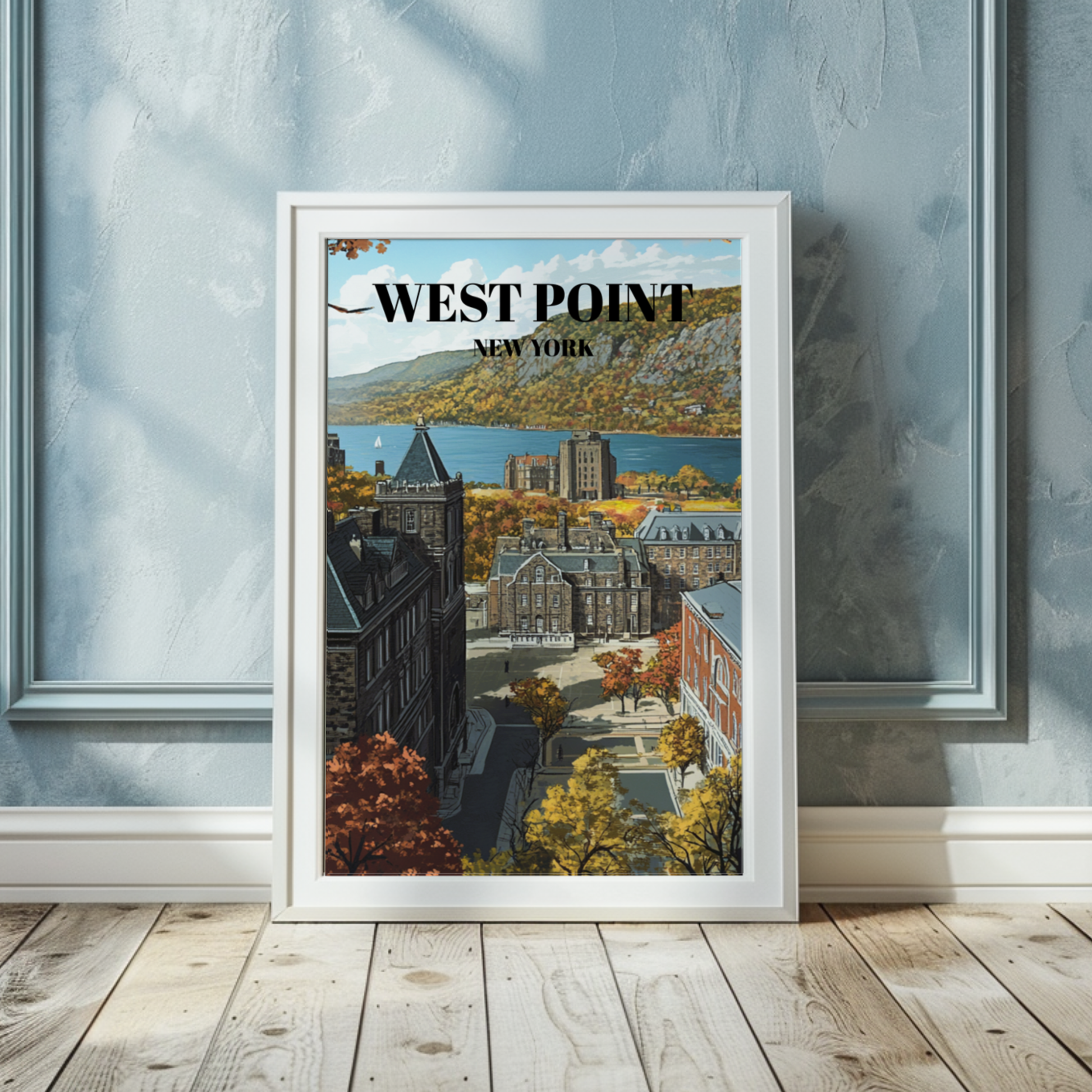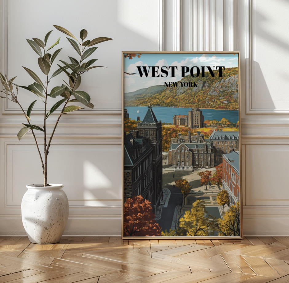 Celebrate the rich history and breathtaking scenery of West Point, New York with this beautifully designed travel poster featuring the iconic U.S. Military Academy on the banks of the Hudson River. Perfect for Army cadets, veterans, history buffs, and patriotic decor, this vintage-style wall art makes a thoughtful graduation gift or keepsake. Add timeless charm to your home, office, or dorm with this historic landmark print, showcasing one of America’s most prestigious institutions.